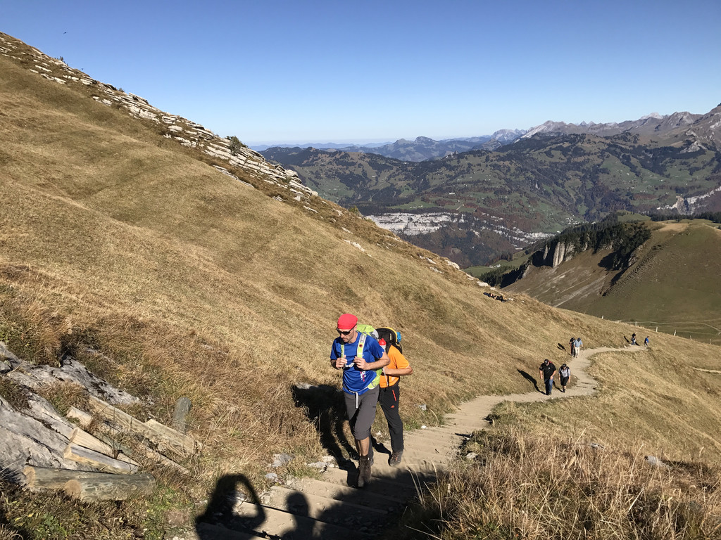 跟着5个天性就是能折腾的瑞士人,我还能有什么选择。当然是玩法3啦。其实这也是大部分瑞士人徒步的标准方式:从山谷攀登上山,然后在山顶远眺打尖儿小息嗮太阳发呆聊天,最后坐缆车下山。所以瑞士人找你爬山徒步,尤其是你腿脚不是完全康健的话,一定要先问明白,整个行程的长度,海拔落差,和大致所用时间(瑞士所有的徒步指示牌都标的非常明白)。要不然,后悔药在半山腰是绝对找不到的。