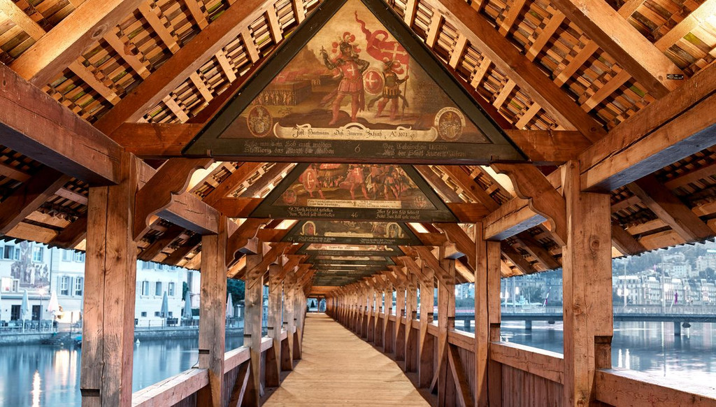 举世闻名的教堂桥(Chapel Bridge)是欧洲最古老的木桥、卢塞恩被拍摄最多的景点,它与水塔一起构成了城市无可比拟的地标。教堂桥始建于1360年左右,现在的木桥长205米,连接着罗伊斯河(River Reuss)南岸的卢塞恩剧院和Rathausquai的圣彼得教堂,途中经过水塔。