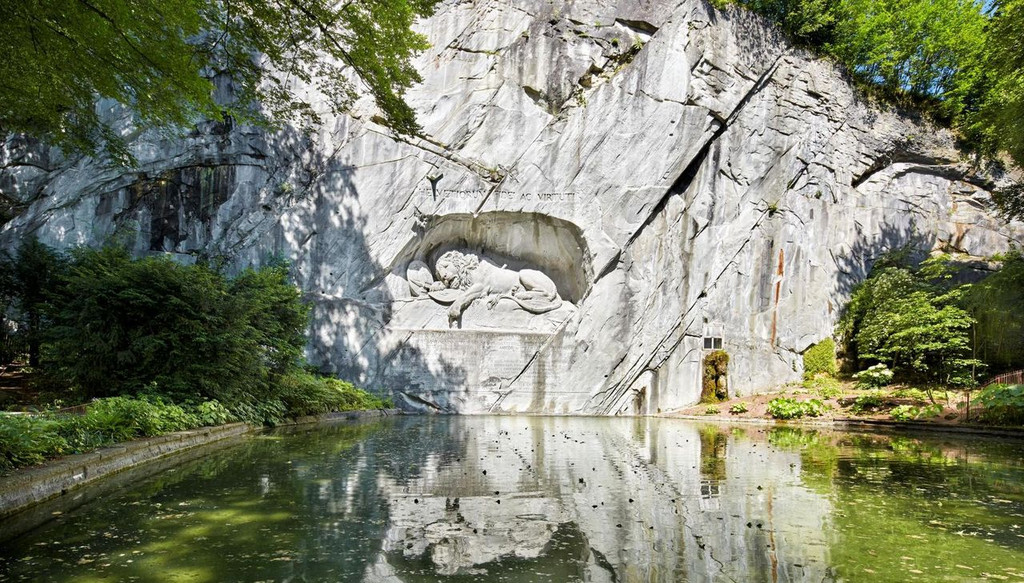 狮子纪念碑(Lion Monument)建于卢塞恩一座公园的岩洞之中,以一头负伤卧倒的雄狮形象纪念光荣牺牲于巴黎的瑞士军团,其栩栩如生的神态令人动容,是世界著名的雕刻作品和地标之一。