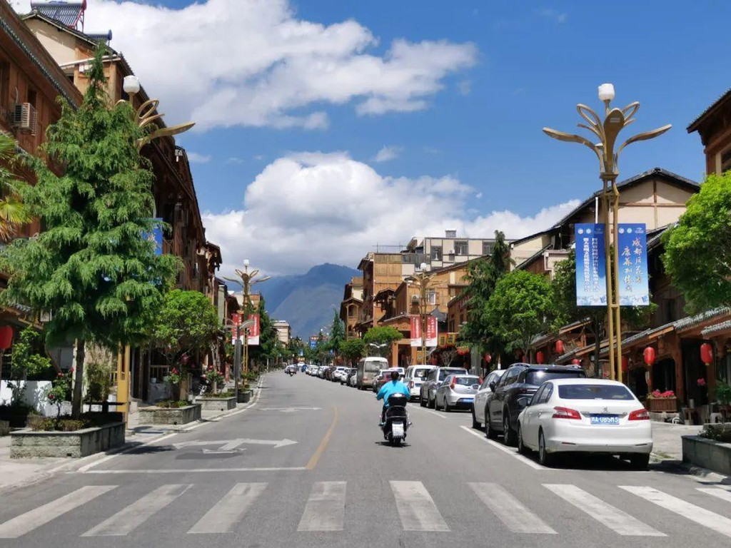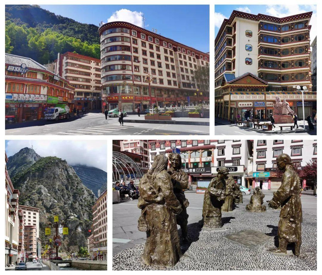 建筑有藏族传统的色彩,又有设计新颖的线条,摩登繁华的步行街外,紧挨着苍劲挺拔的高山,让人觉得既时尚,又传统,既浪漫,又古朴。