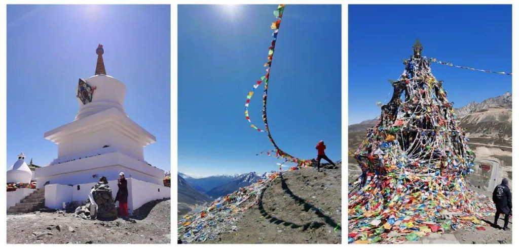 因着分界的特殊地位和壮美的自然风光,折多山垭口是我一路上所遇装饰最豪华的垭口和游客停留时间最长的垭口之一,尽管过高的海拔让此地风大、气温低、紫外线强,还是有很多人爬上更高处的山丘,和白塔合影,共风马招展。