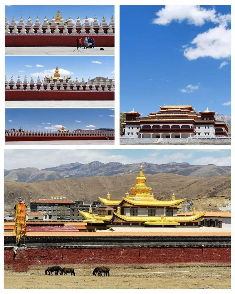 塔公草原上另一座藏传佛教建筑是木雅尊胜塔,为纪念十世班禅大师在此传法而建,集藏经楼于尊胜塔于一体,用108斤黄金贴顶,金塔四周有4座台阁式佛塔,每座塔内装藏10万小佛塔,金塔外还有383米长的转经廊,装有470个转经筒,可谓金碧辉煌,不厌繁复。