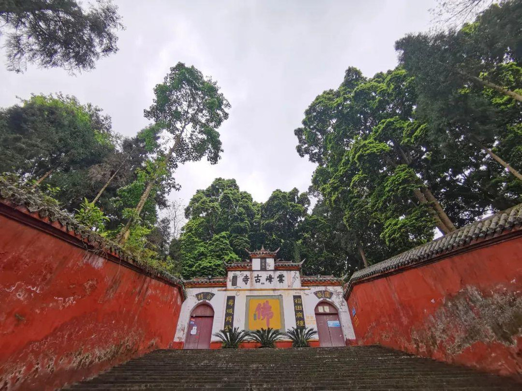 云峰寺始建于唐,赐额于宋,兵毁于元,修复于明,续修于清。寺有三奇——古楠、神水、太湖石;又有三绝:佛塔、风洞、摇亭碑动,吸引诸多文人墨客光顾,张大千、许世友、刘文辉等均曾在此吟诗作画、挥毫泼墨。