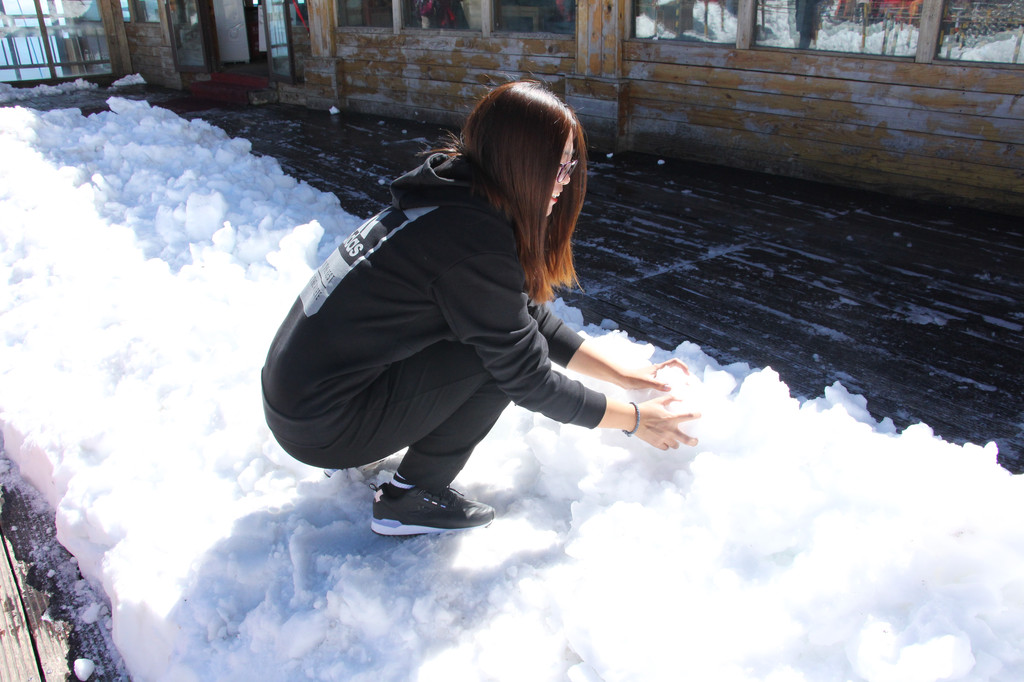 身上穿的租赁的大羽绒服,保暖至上。还行,衣服没有想象中的那么难看。不过女款的红色的大羽绒服就稍微有点。。。