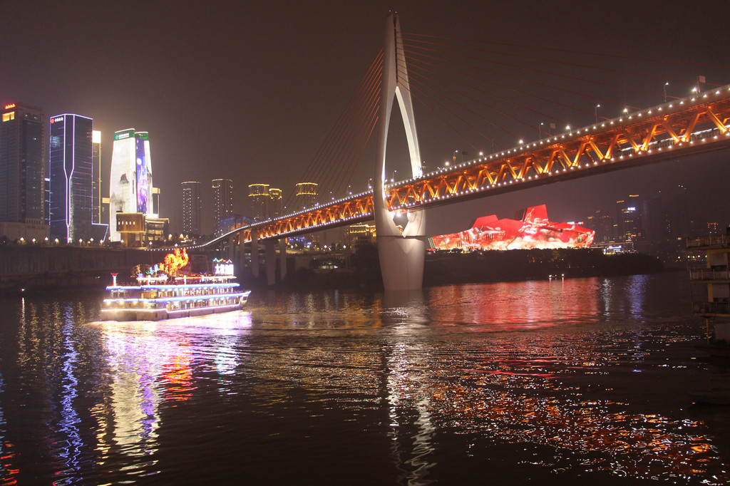 逛着逛着,千厮门大桥的灯光亮起来了。第一次来的时候还以为这下面就是长江,后来一看地图才知道这是嘉陵江,再前面就于长江汇合了。
