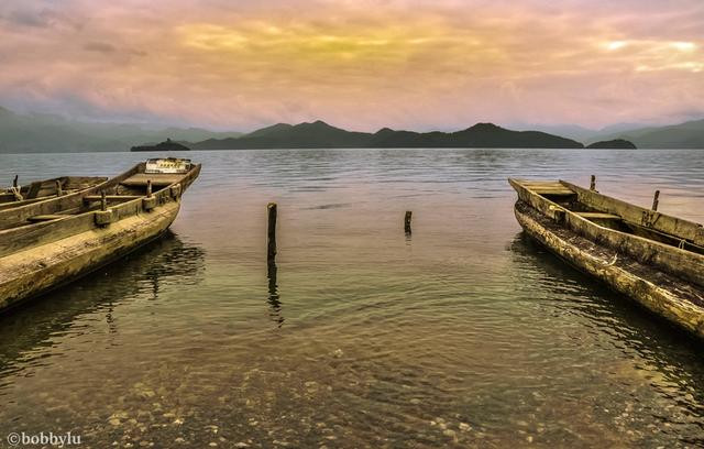 傍晚时分的泸沽湖尤其的美,天边的云霞映红了平静的水面,木舟静静的停泊在岸边。偶尔荡漾在水面上的白色小花轻柔的涌动着,在后来我才知道,这种花在这里有着一个说起来稍微让人脸红的名字,叫“水性杨花”,记得就连在当地喝的啤酒,都叫这个名字。总而言之,泸沽湖一直就那样静静的,也一直是那样唯美的存在......