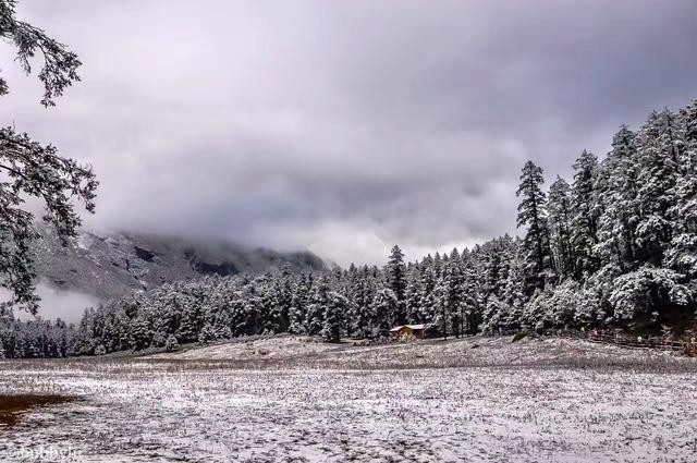 而随着不断的爬升,山间的雾气和湿度也是越来越大,不知不觉,行进至云杉坪时,下起了大雪。山间的能见度顿时骤降,以至于根本就看不见刚上山时还相对透彻清晰的天空,而仅在眼前的玉龙雪山,则早已消失在浓厚的云雾之中。无奈之下,只能带着遗憾下山。