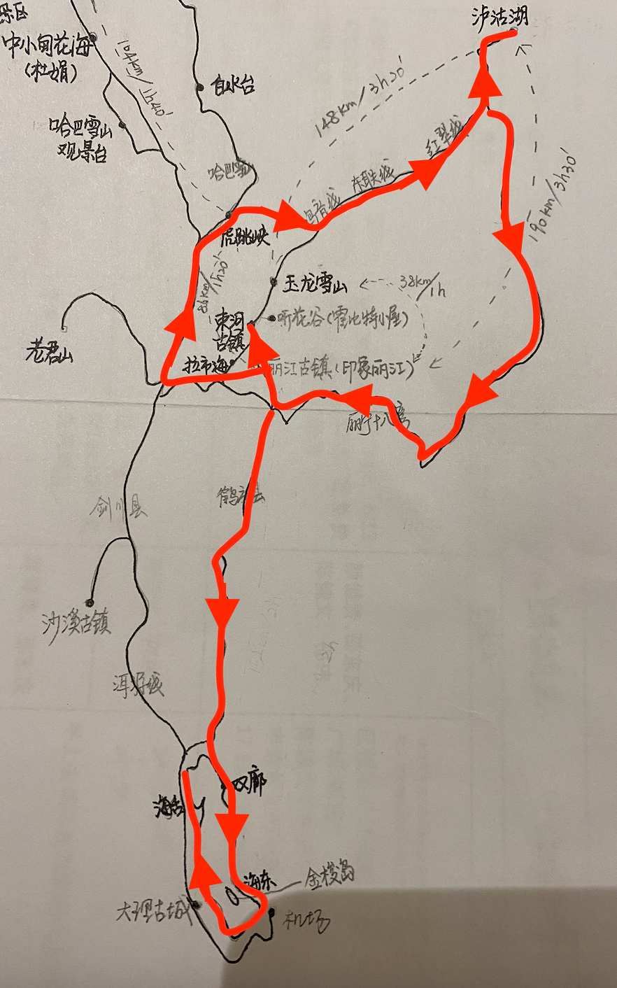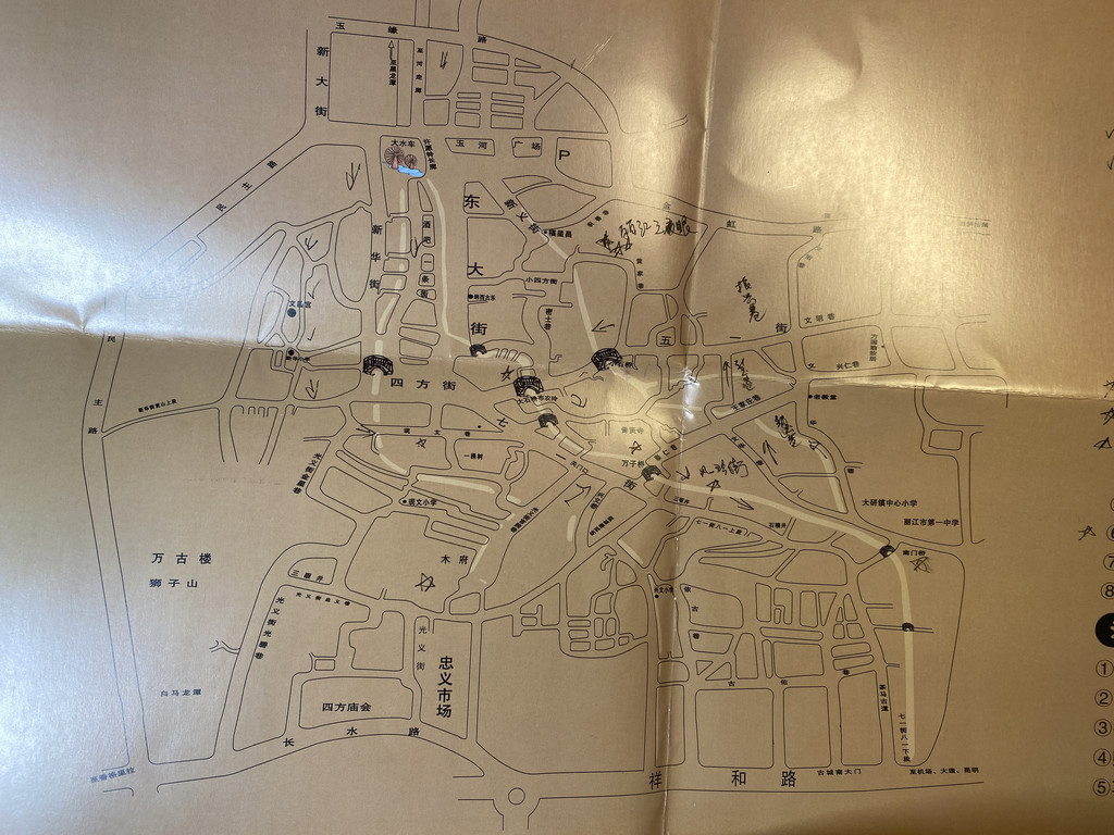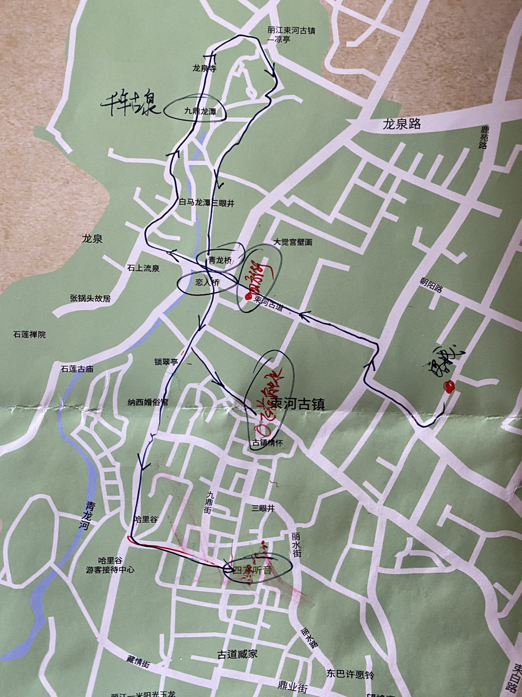 回到束河已是下午1点多了,退房后束河古镇随便转转。客栈小哥画的路线图。