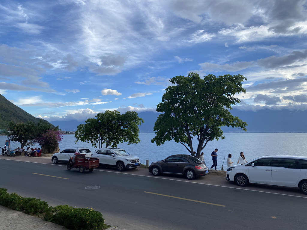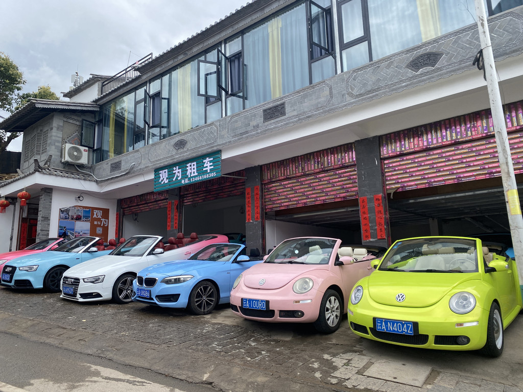 早餐后驱车赶往双廊古镇,洱海周边有很多租车的地方,这些颜色亮丽的敞篷车拍照很出片,深受年轻人喜欢。