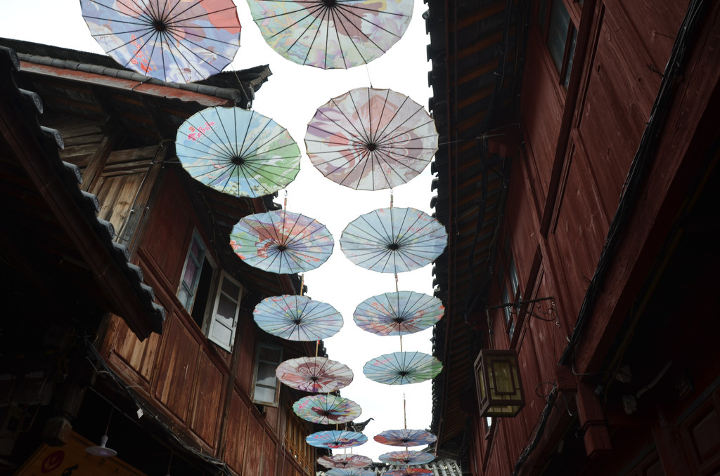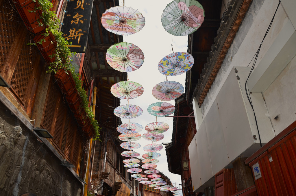 四方街的一个路口进去就是油纸伞街,白天的油纸伞色彩淡了些,没有晚上的惊艳。