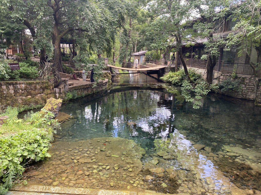 青龙桥是一座建于明朝的古桥,距今已有400多年的历史,它的西面就是聚宝山,青龙桥的中轴线正对着聚宝山,这是木氏土司的设计,也是木氏土司鼎盛时期的标志性建筑。但要注意桥很光滑,走路要小心