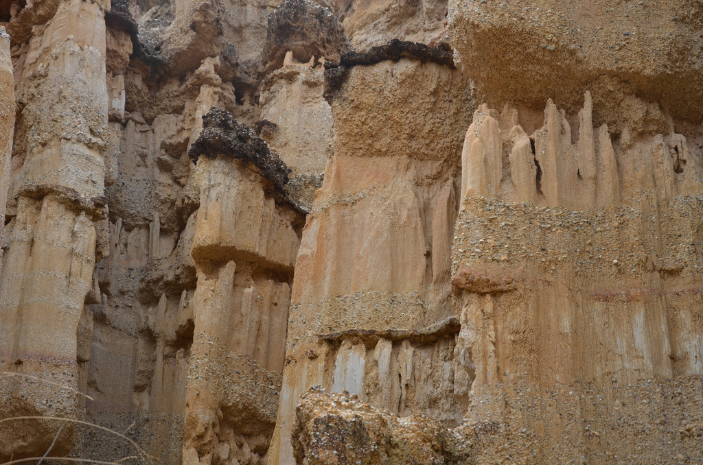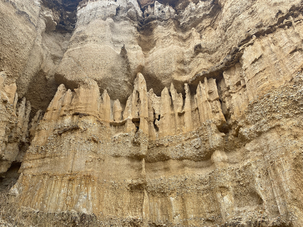 虎跳滩土林总面积6平方公里,形态多以城堡状、屏风状、帘状、柱状为主。各种形态的土柱错落纵横,高达42米,颜色有红色、黄色、白色、褐色等。远远望去,虎跳滩土林千峰林立,沟壑纵横,荒凉粗犷,像一座废弃的城堡,又像一组组工程巨大的艺术群雕。
