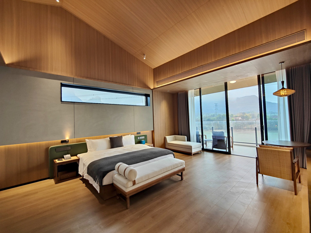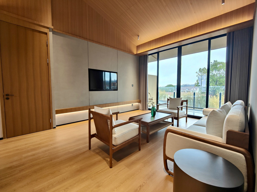 入住的“山岚静舍”套房足有130平方米,全落地玻璃将山色尽收眼底。推开露台的木门,春风裹挟着山野气息扑面而来,远处层叠的油菜花田如金色海浪般蔓延至山脚,与零星点缀的晚梅交织成春日的序曲。套房内设计古朴雅致,一篮免费供应的欢迎水果与本地小吃,悄然传递着山居的温情。