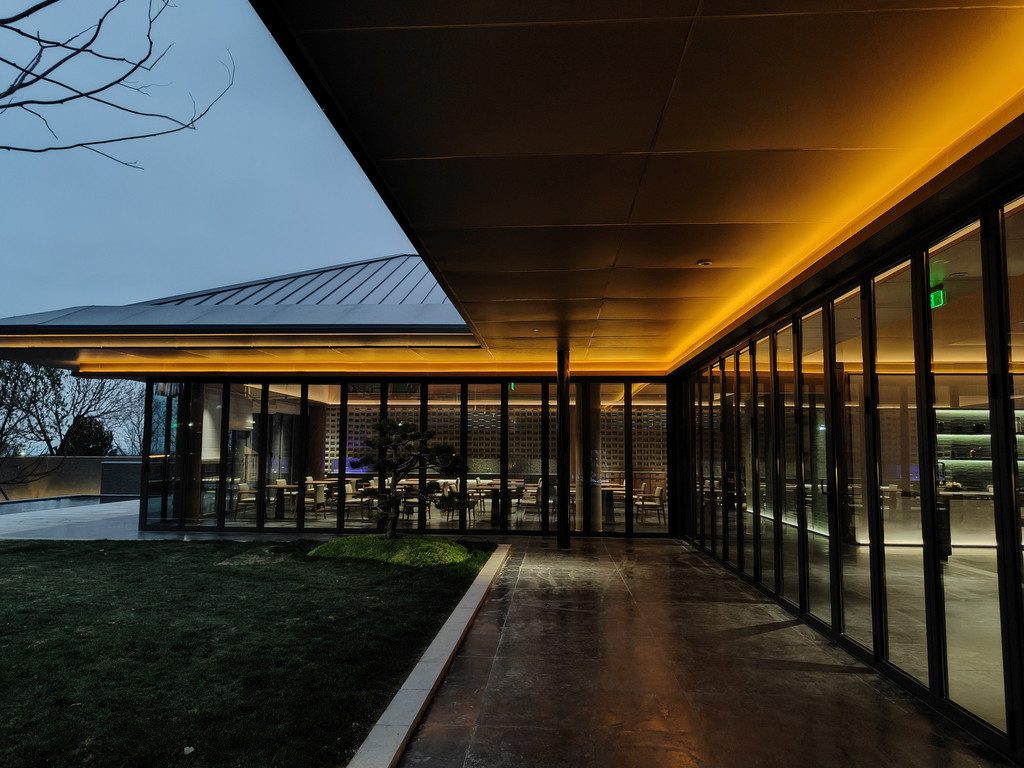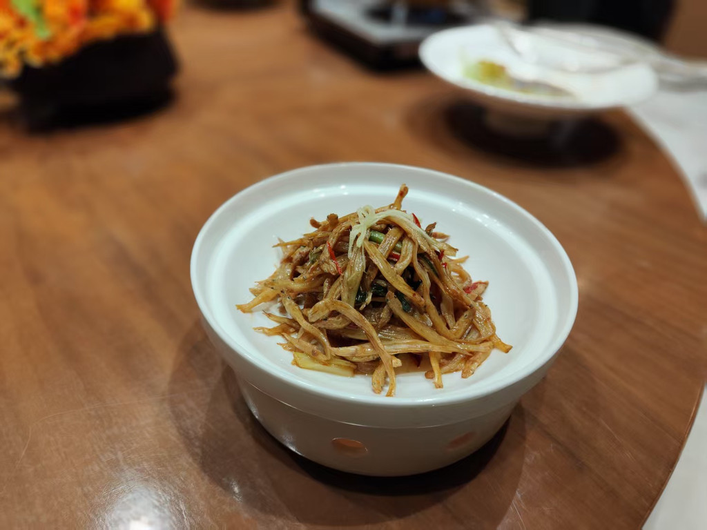 晚餐是地道的庐江融合土菜。金汤湖鱼头炖豆腐,汤色乳白,鲜香醇厚;凉拌百花菜清爽开胃,取自山间野菜;主食“庐江小红头”甜糯不腻,佐以酒店自酿的桂花米酒,每一口皆是山野馈赠。餐厅外的露台上,晚风轻拂,远眺岱鳌山轮廓渐隐于暮色,唯有虫鸣与星辉相伴。