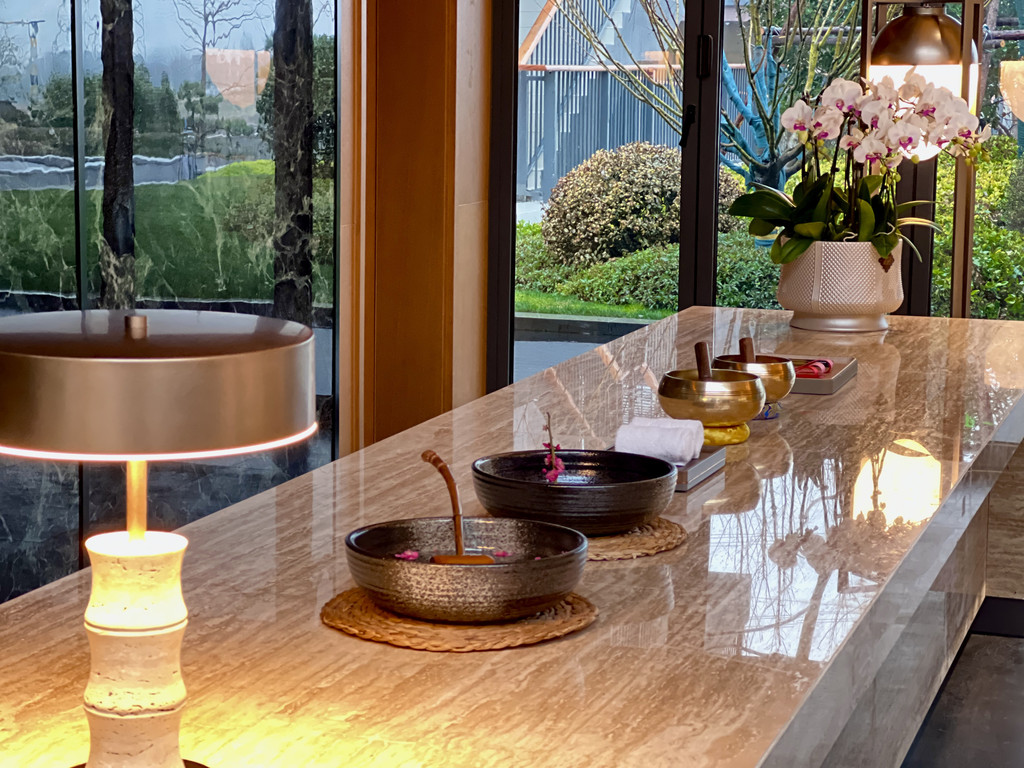 午后返回山居,参与酒店精心策划的静心活动。手工室内,艾草与檀香的芬芳弥漫,导师指导制作中药香囊。将晒干的薰衣草、陈皮与金银花装入绣花布袋,一针一线间,浮躁渐褪。随后移步茶室,焚一炉沉香,提笔抄经。宣纸上的墨迹随呼吸起伏,窗外竹影婆娑,时光仿佛凝滞。傍晚的“颂钵疗愈”更是点睛之笔,铜钵的低频震动与山泉叮咚交融,身心如被清泉涤荡,归于空灵。