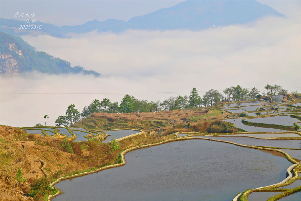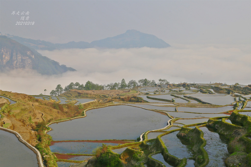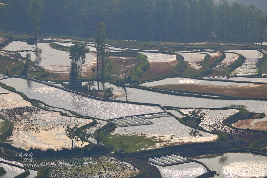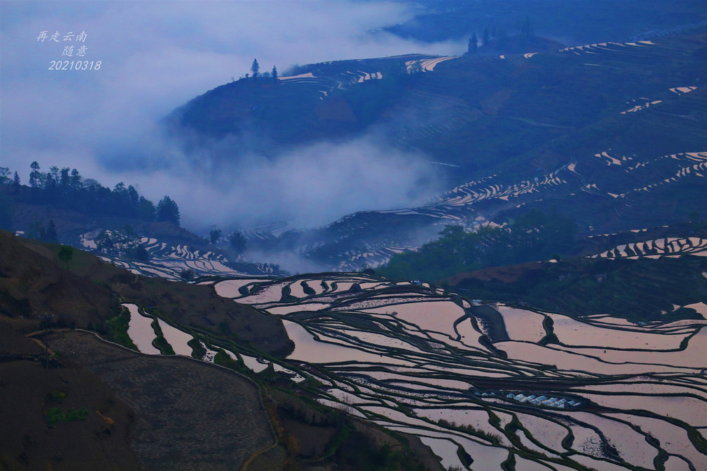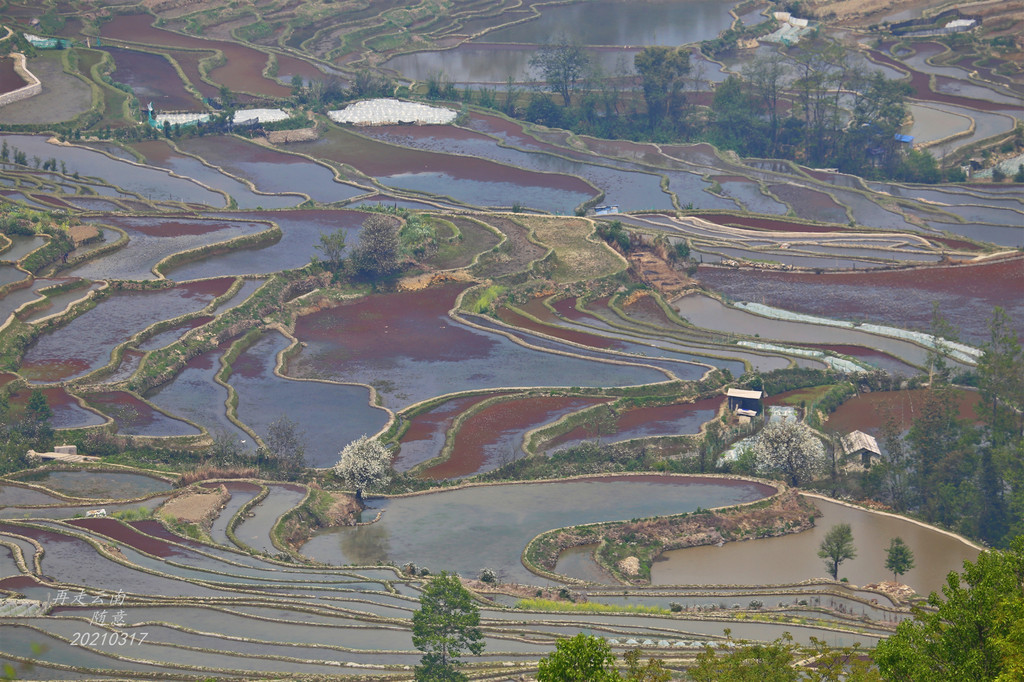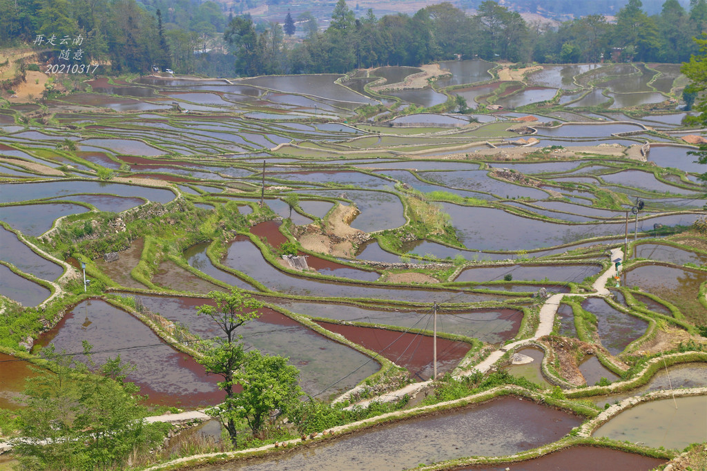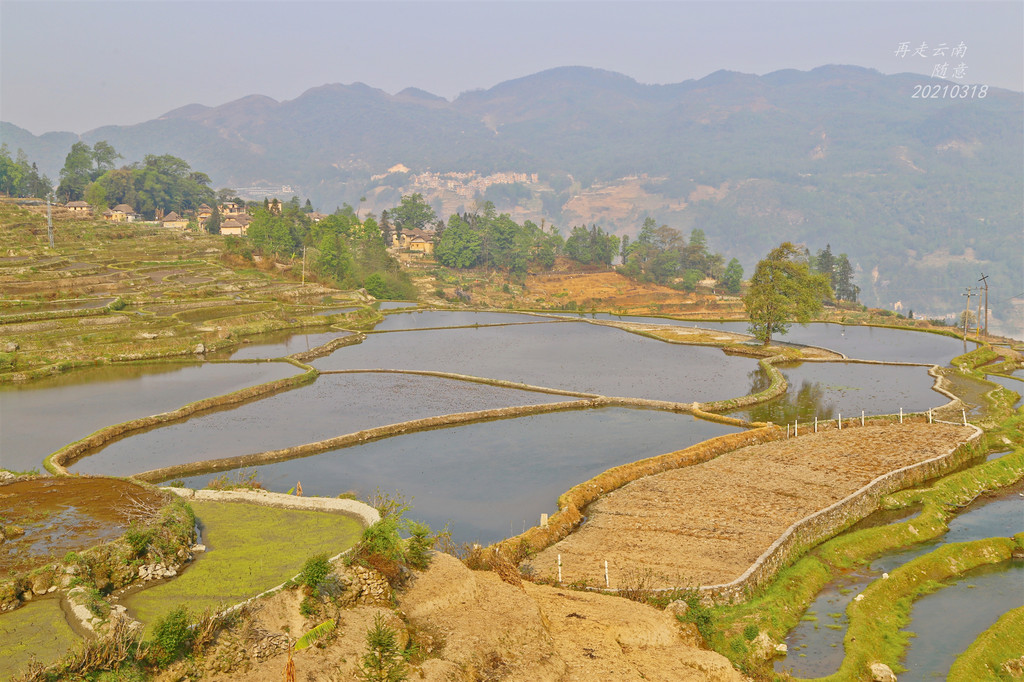 回到民宿,吃了早餐,9点退房前往爱春蓝梯田:爱春梯田临近多依树,又名蓝色梯田,梯田的水映衬了天的蓝色,天光云影共徘徊,水就蓝色,颇为好看。