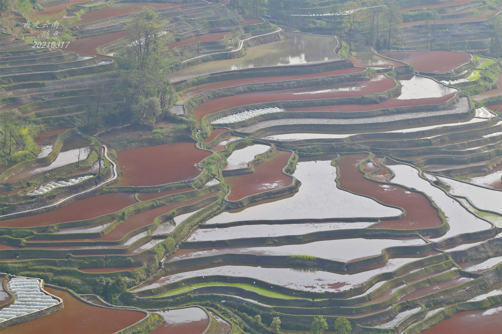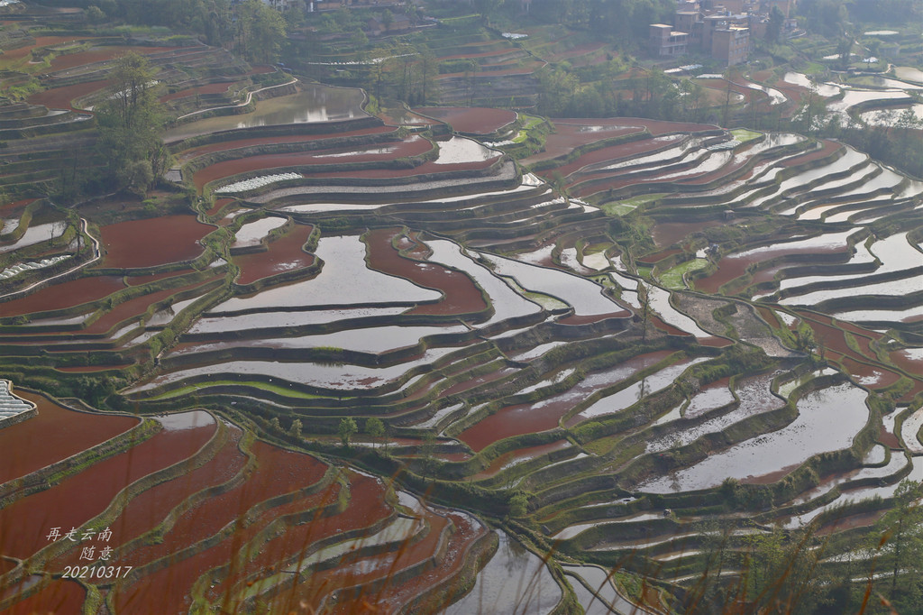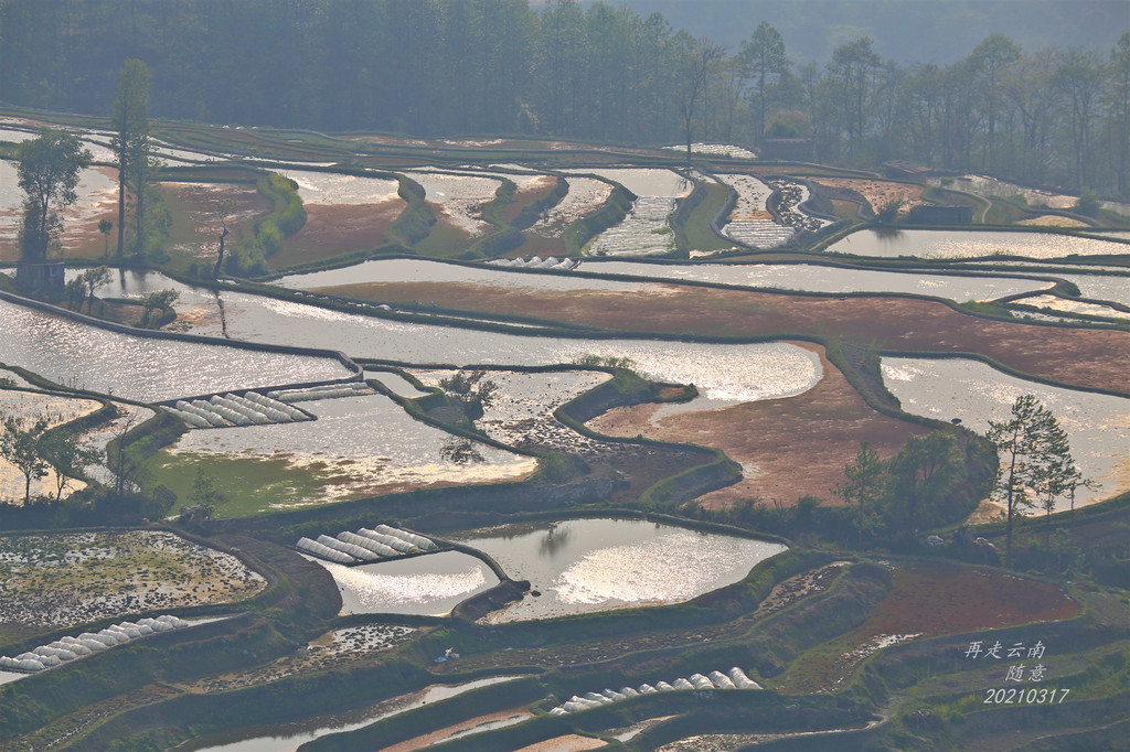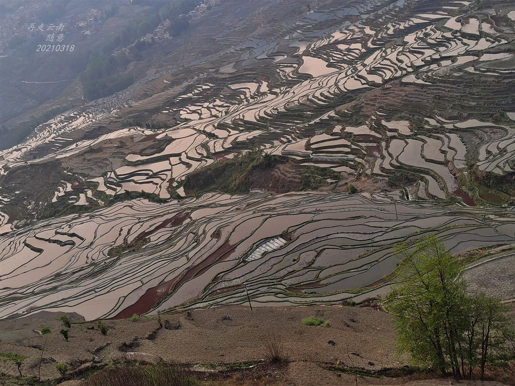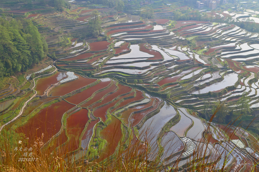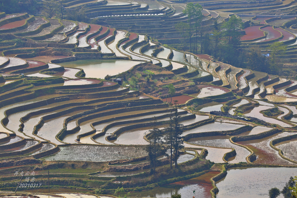 回到民宿,吃了早餐,9点退房前往爱春蓝梯田:爱春梯田临近多依树,又名蓝色梯田,梯田的水映衬了天的蓝色,天光云影共徘徊,水就蓝色,颇为好看。