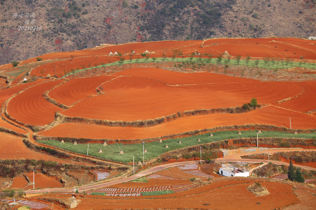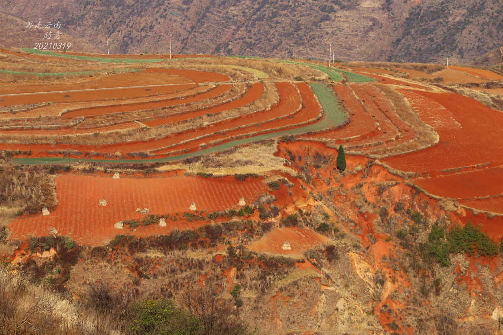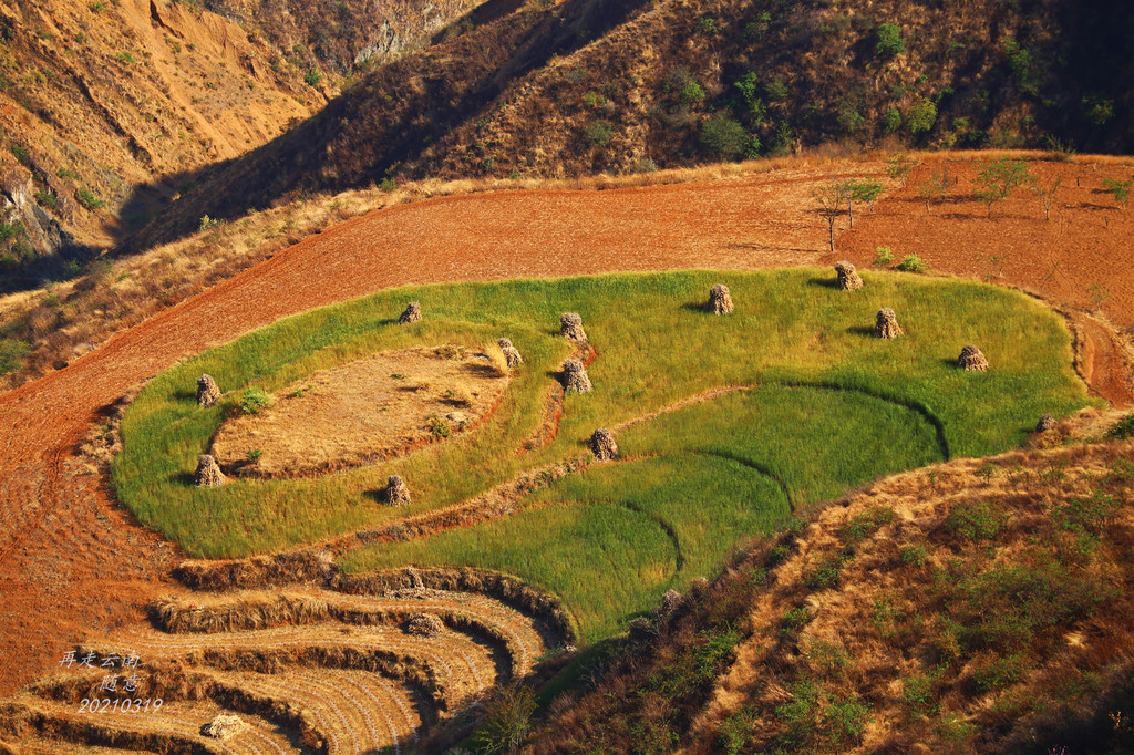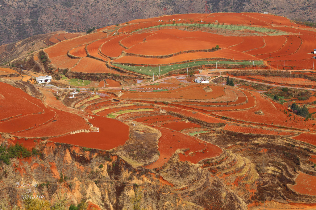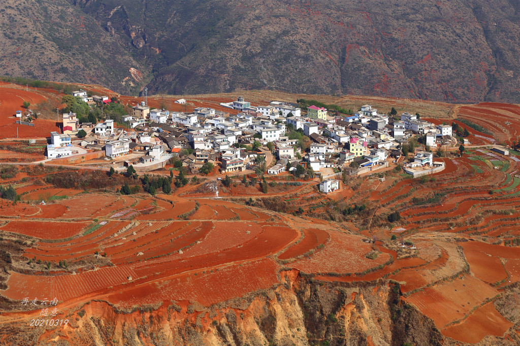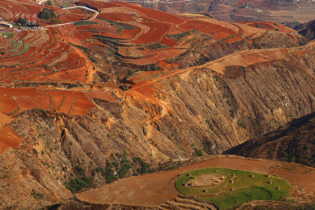 落霞沟也叫陷塘地,是崇山环抱中突然下陷的一块洼地,有人说落霞沟是红土地最美的地方之一,不同的季节,落霞沟会呈现出不同的美景,晃如人间仙境。远远望去,红绿相间的色块和线条,如梦如幻,斑斓的色彩扑面而来,让人仿佛瞬间忘记了呼吸。