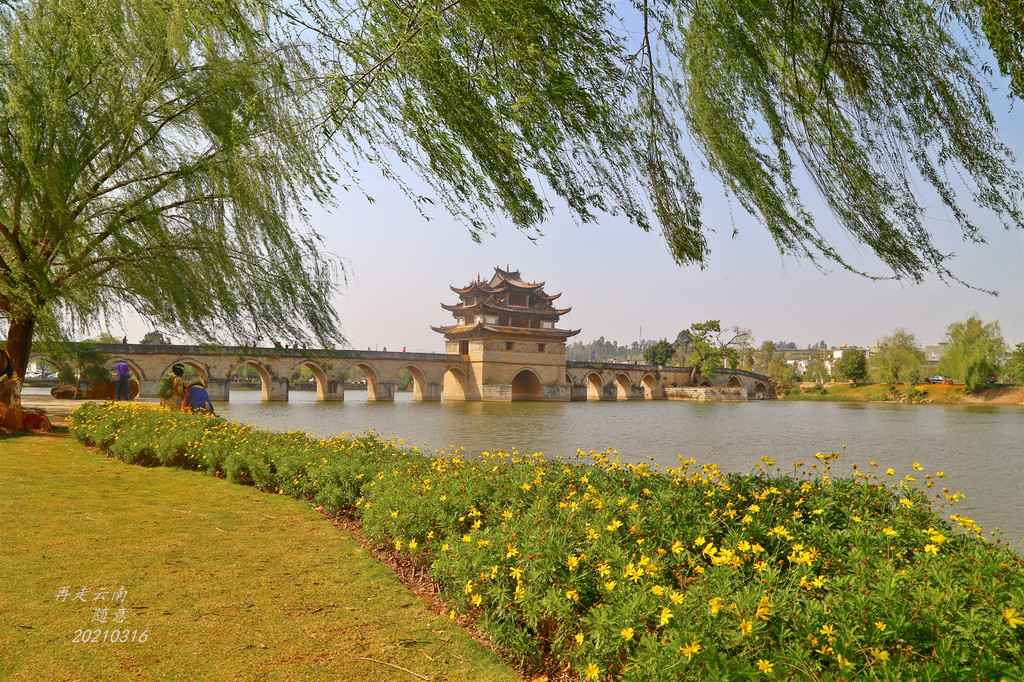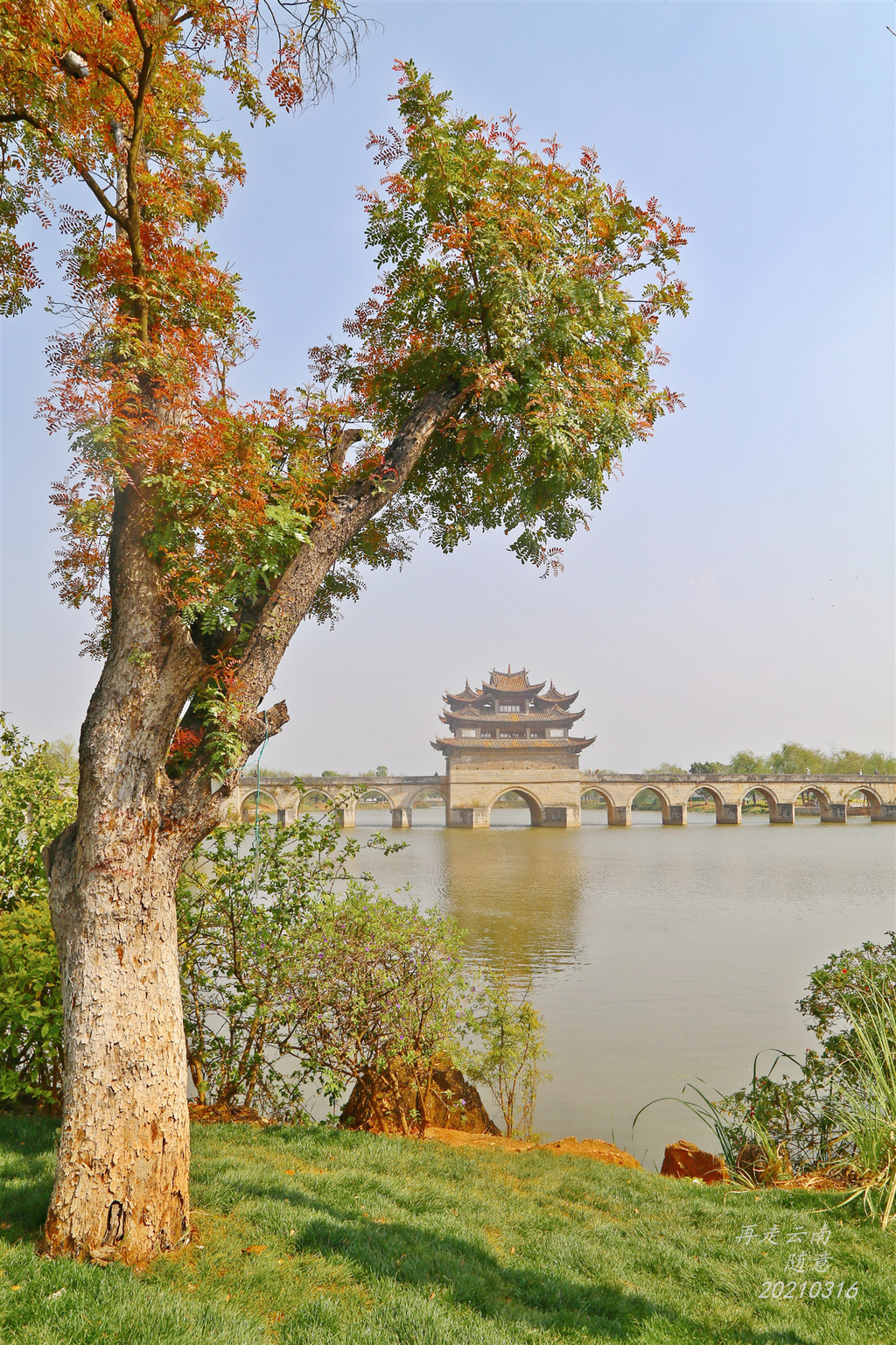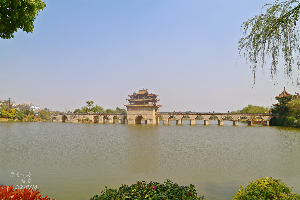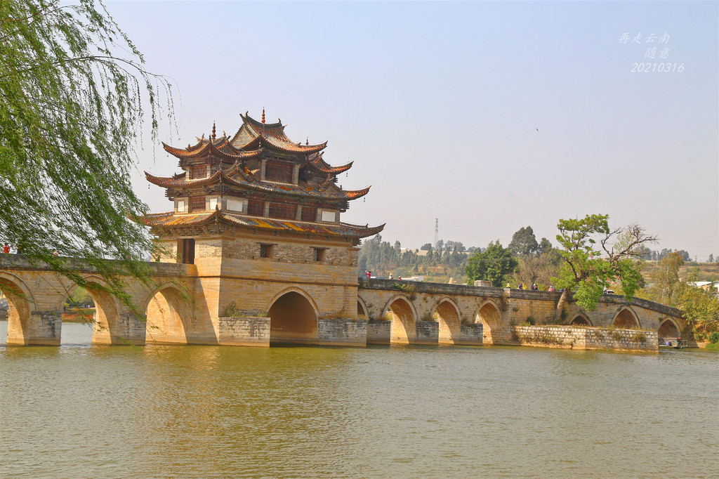 今天凌晨4点出发,坐7点10分的飞机到昆明,下飞机后前往一嗨机场的租车点把小小白提上才10点半,直接我们这次行程的第一站建水,2点半来到建水的第一个景点建水十七孔桥:又称双龙桥,位于建水古城的西边5公里处,横跨在泸江和踏冲河交汇处。这座古桥建在清朝年间,是云南的一处著名的古迹,古桥一共有17孔相连,桥上还有三层楼阁,显得古老又很有气派