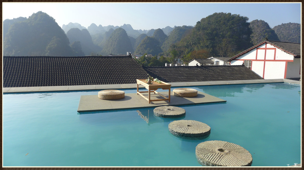 景堂客栈距停车场不远,依山而建、设计巧妙。屋顶,碧水幽幽,禅意满满,一杯香茗在手,万座峰林尽览。