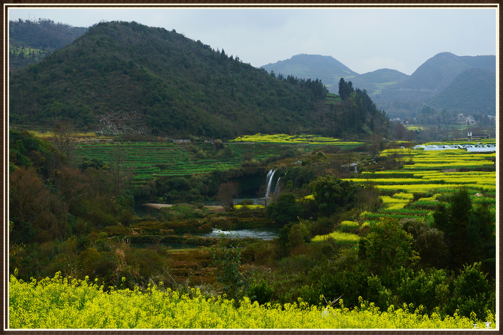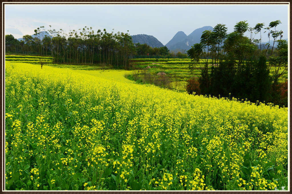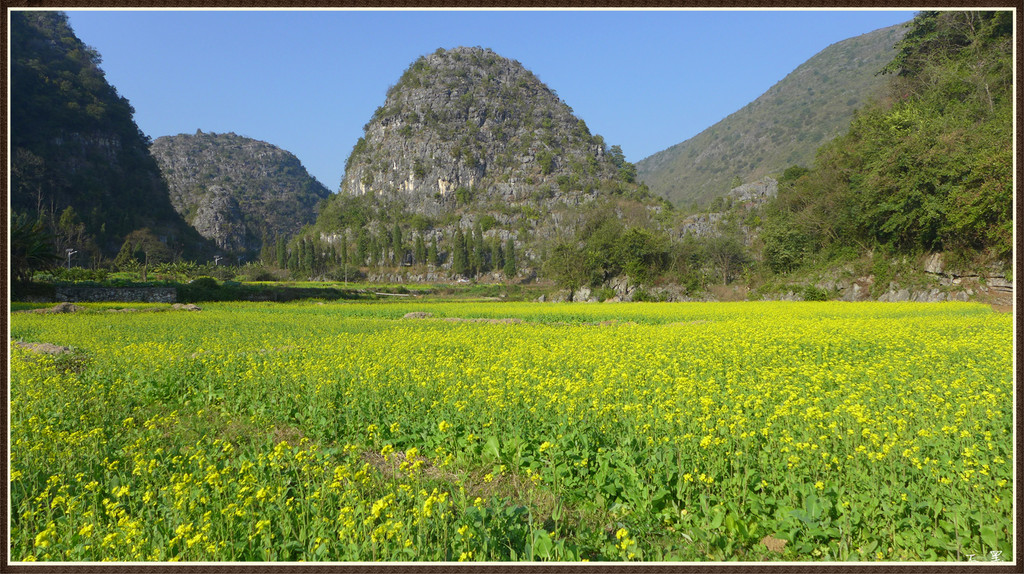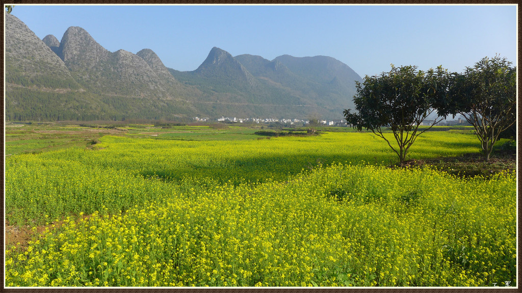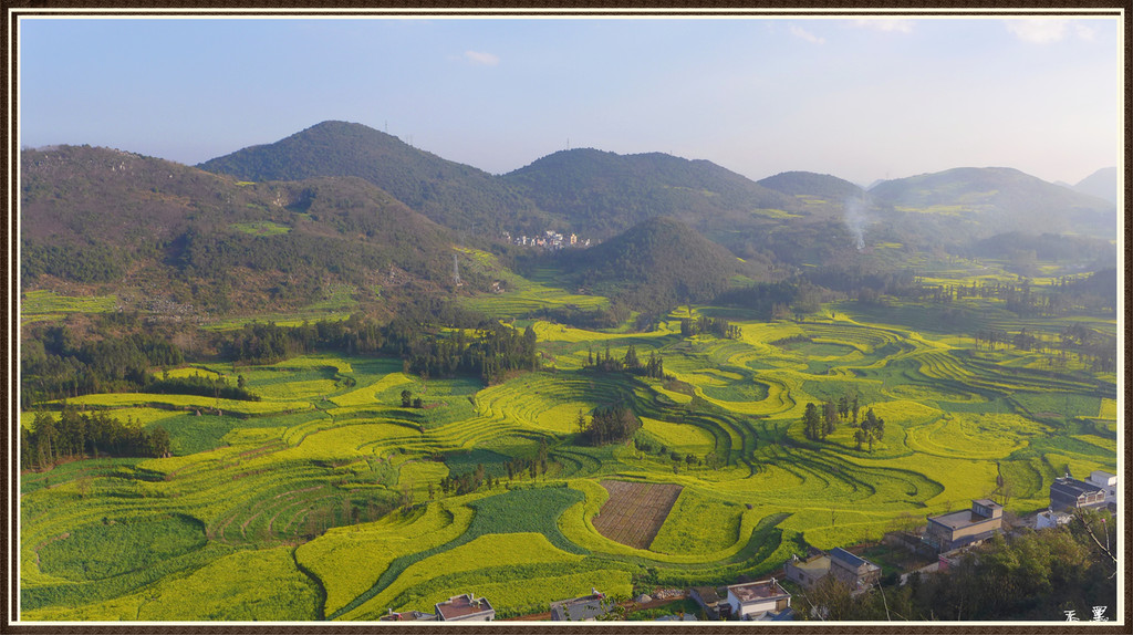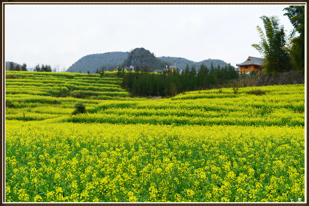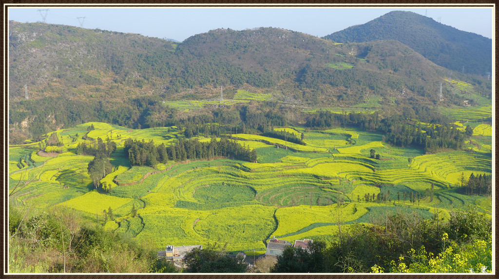 从入口进,油菜花漫山遍野,峰从若隐若现,林木掩映中房舍俨然。