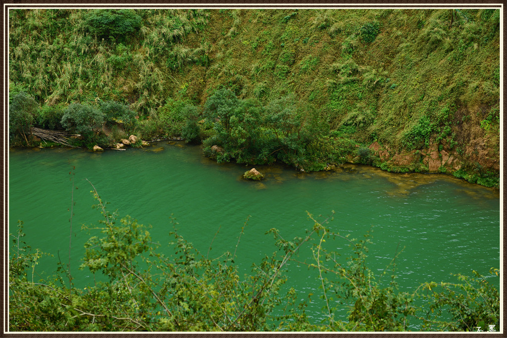 溪流下的水潭绿油油如宝石。