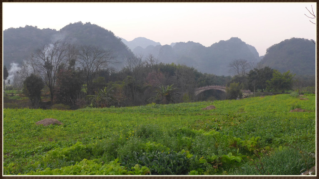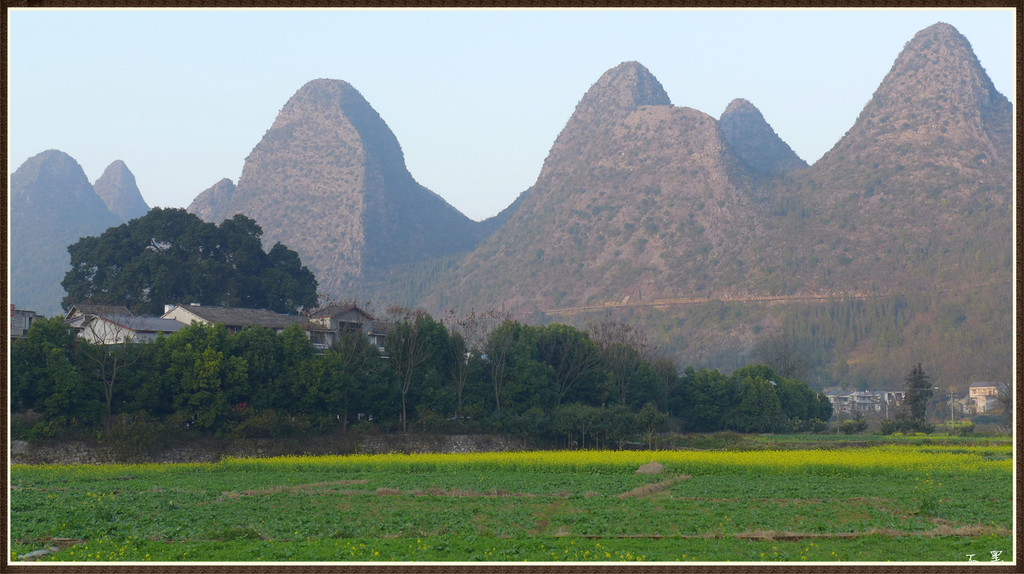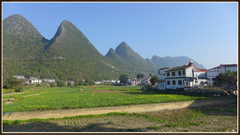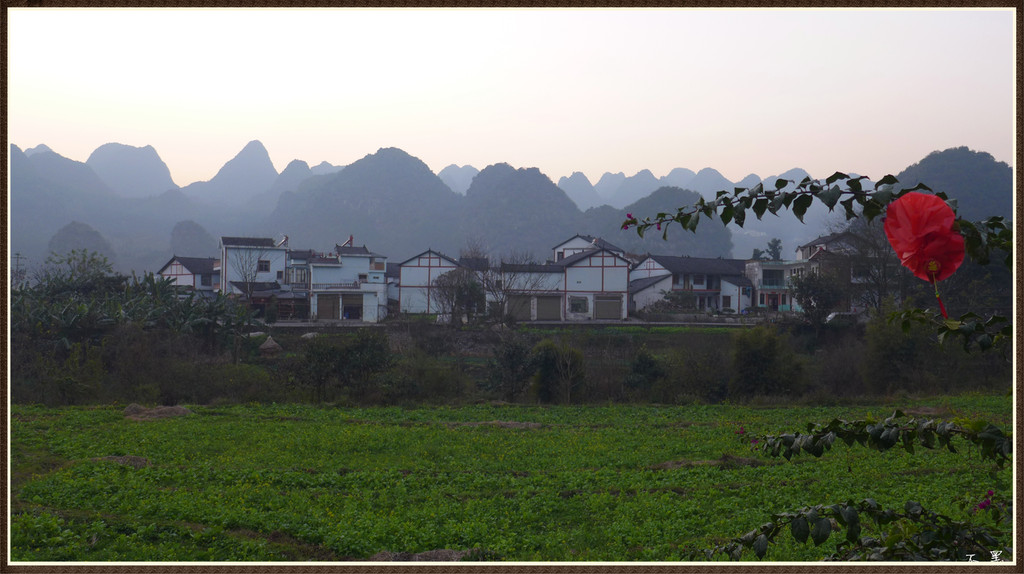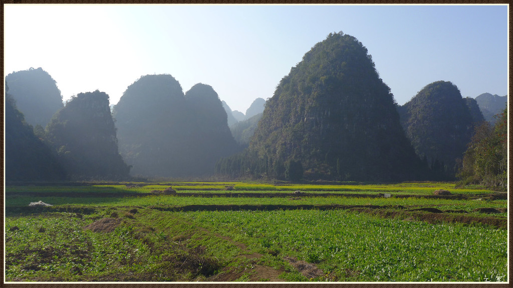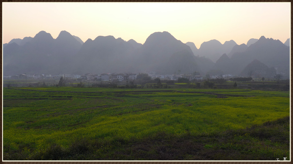 伴着落日的余晖,漫步山野田间,群峰争奇,村舍隐约,炊烟袅袅,芳草茵茵,好一幅峰林山居图画。