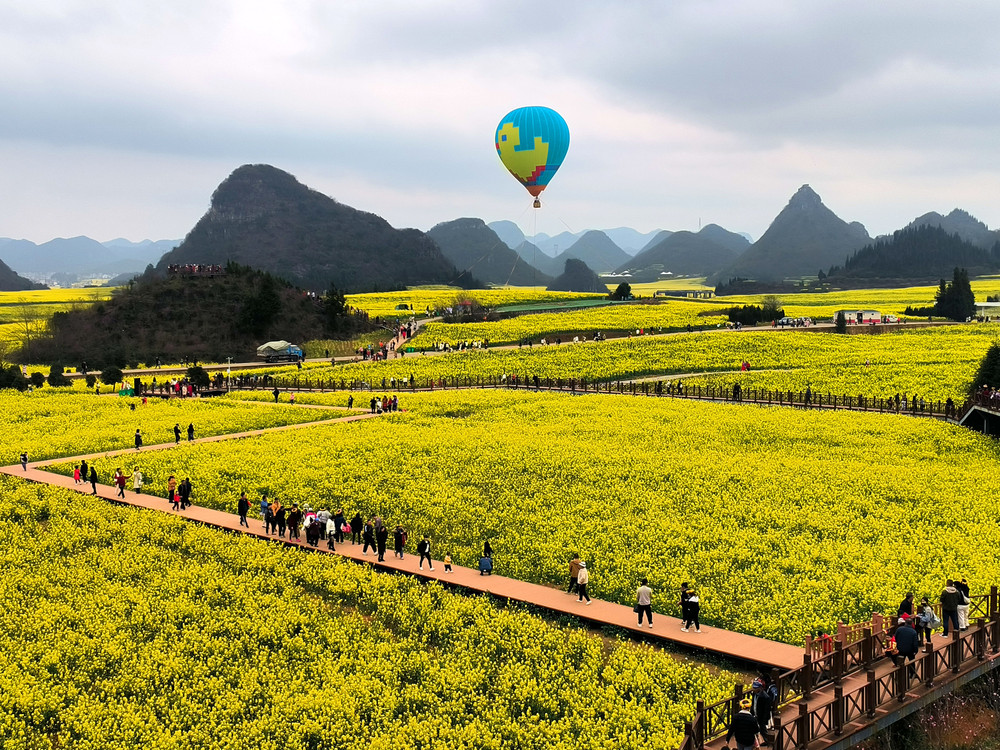 在金鸡峰丛景区,人们可以乘小火车或景区电瓶观光车,围着占地面积庞大的油菜花海转上一大圈。或者,你可以顺着架在油菜花海上的观光栈道信步遨游,从不同角度近观花海美景。