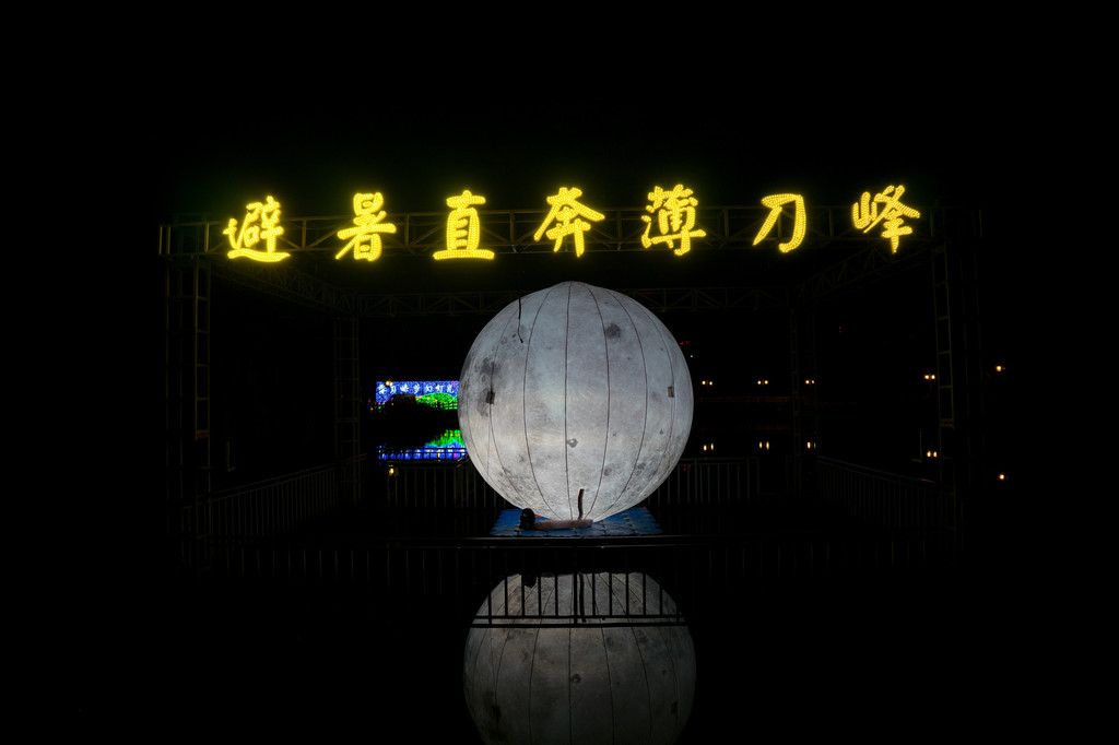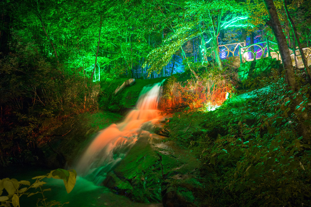 水流淙淙哗哗,虫鸣啼啼啾啾,两相交织,奏响着自然天籁之乐,婉约灵动;五颜六色的灯光,装扮着圆梦谷,也荡漾了游客心情。在湖水中点上一盏莲花灯,祈福祷告。承载着梦想与希翼、憧憬和期盼,多彩的河灯,正是人间繁华的最美缩影。
