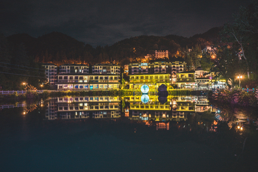 吃饱喝足,沿着一级级阶梯而下,来到圆梦湖边,房屋民居倒影水中,朦胧亦清晰,如淡淡水粉画,零星亮着点点灯火,勾勒出人间烟火气息,一派宁静安好。