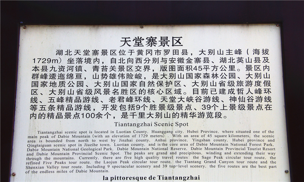 天堂寨(国家AAAAA级旅游景区、国家级自然保护区、国家森林公园、国家地质公园),是大别山第二高峰,由十一届全国人大常委会委员长吴邦国先生题字。