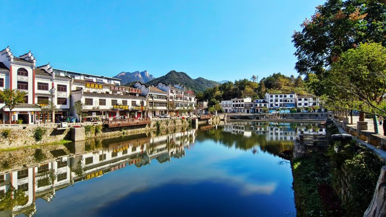 九资河镇春秋时期为楚东鸠兹国,是一座古镇。四面环山,九资河穿城而过,房子临水而建,青砖马头墙,墙体上还绘有花纹,典型的徽派建筑。