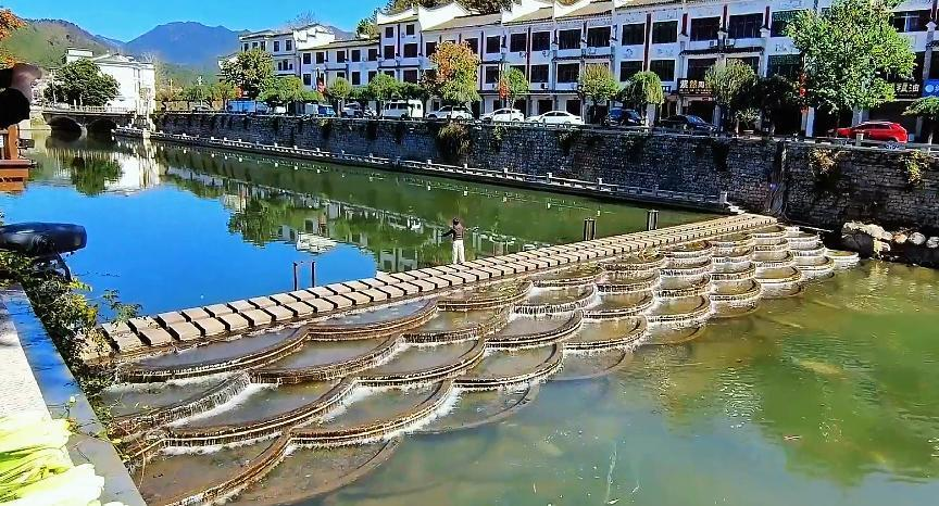 芳草萋萋,竹筏、乌篷船泊在水面。流水从水坝中间的石墩间隙流下,形成一道小型瀑布。伸向河中亭子的倒影在水中摇曳,一派江南水乡风光。