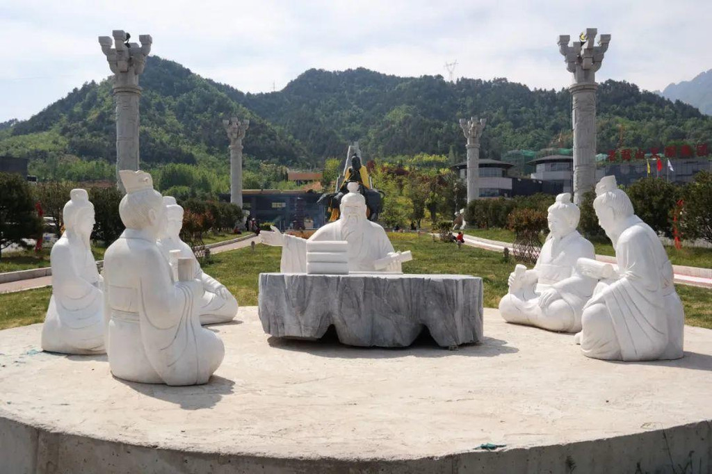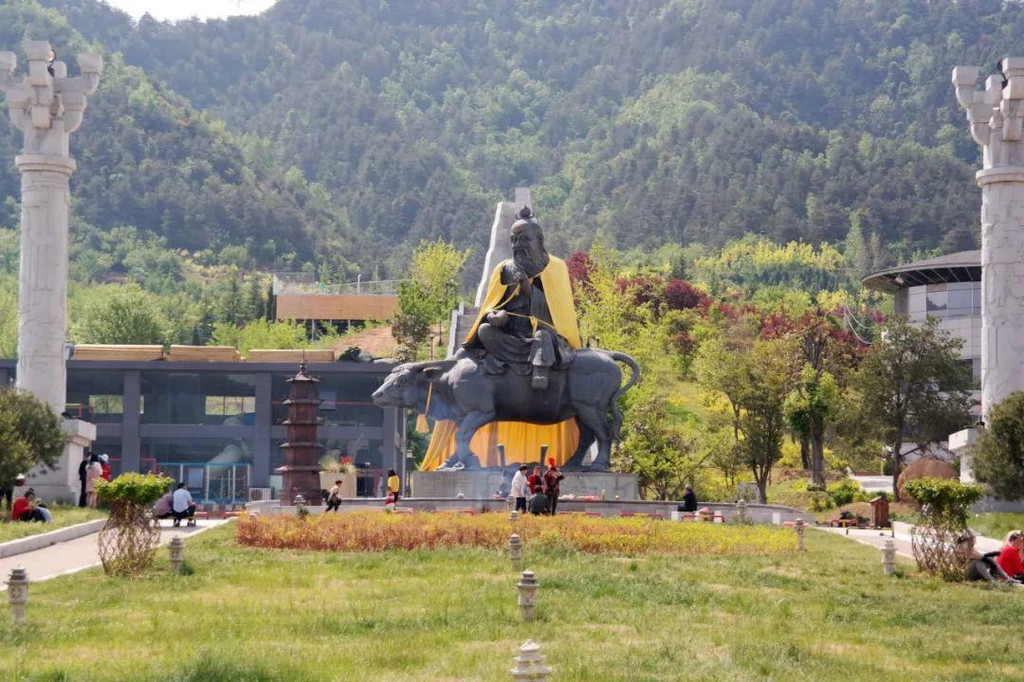 (山脚下的老子骑牛铜像和老子讲经雕塑)