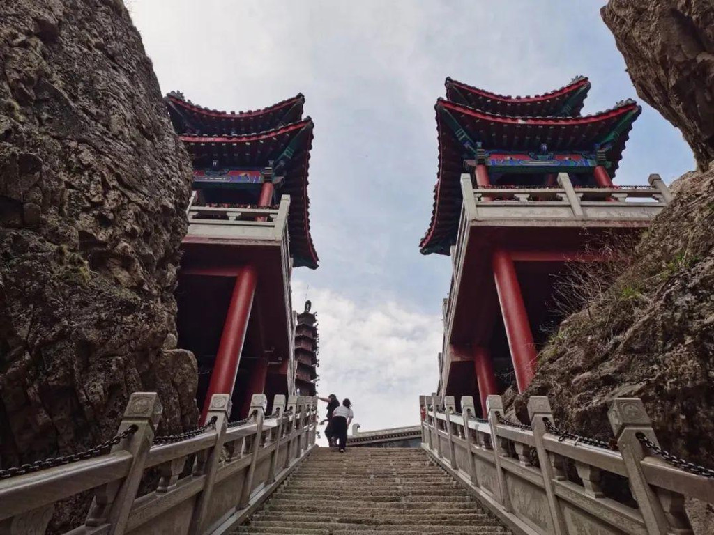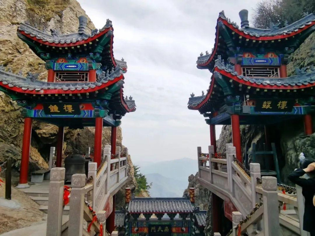 金顶道观群依山而建,入门的钟楼和鼓楼屹立在山崖峭壁上,险峻又威严。