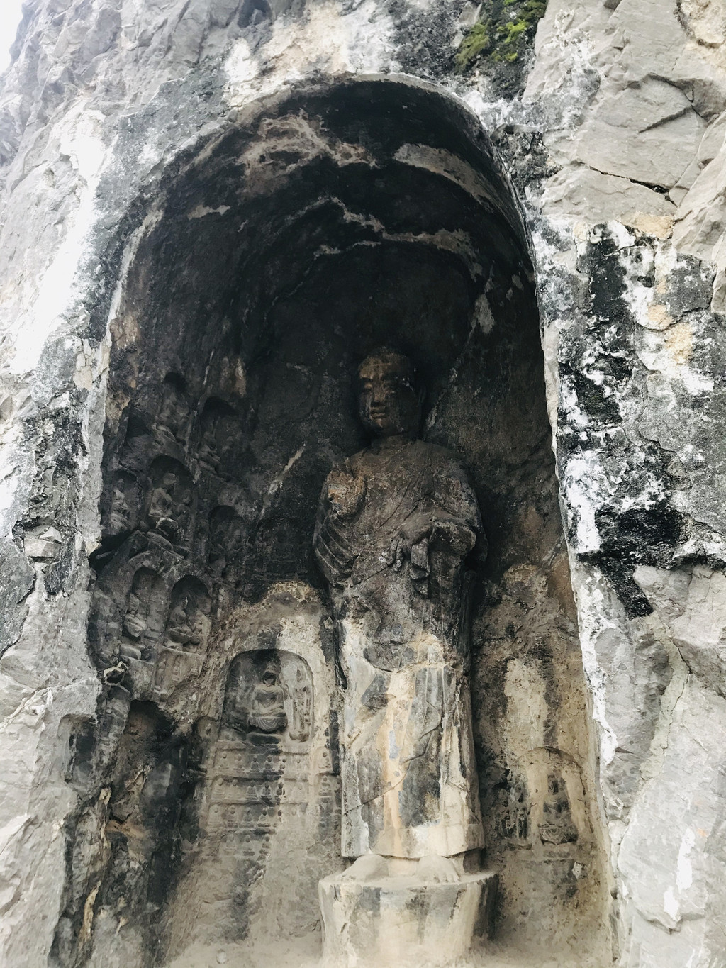 想起一个月前,看到一篇文章有关线上博物馆的,其中特别提到了河南博物馆,线上实景参观古迹等,而现在的自己就站在古阳洞前看释迦牟尼微笑,那种感觉实在太奇妙了。