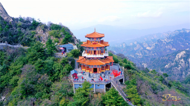 玉皇阁是白云山中海拔最高的一座道观,占地246平方米,两边楹柱刻有“玉帝凌天宇唯尊唯我,生民盼九州至善至德”的对联,为全国作家协会主席王蒙先生登临玉皇顶后所书。
