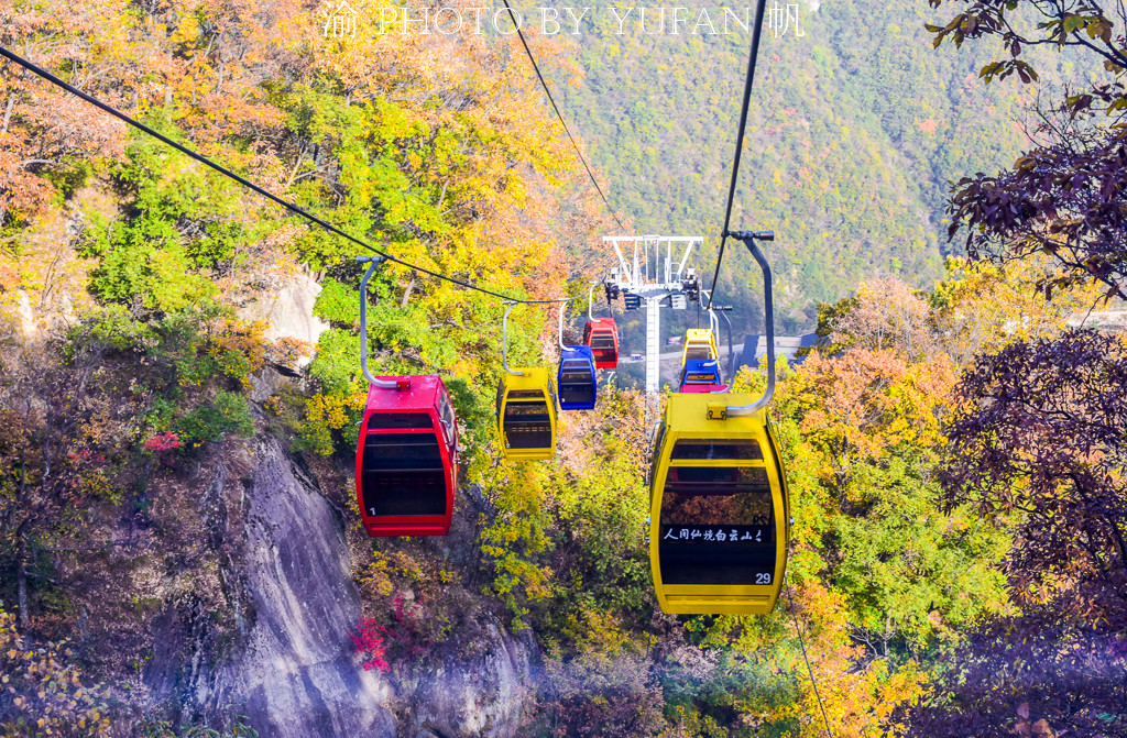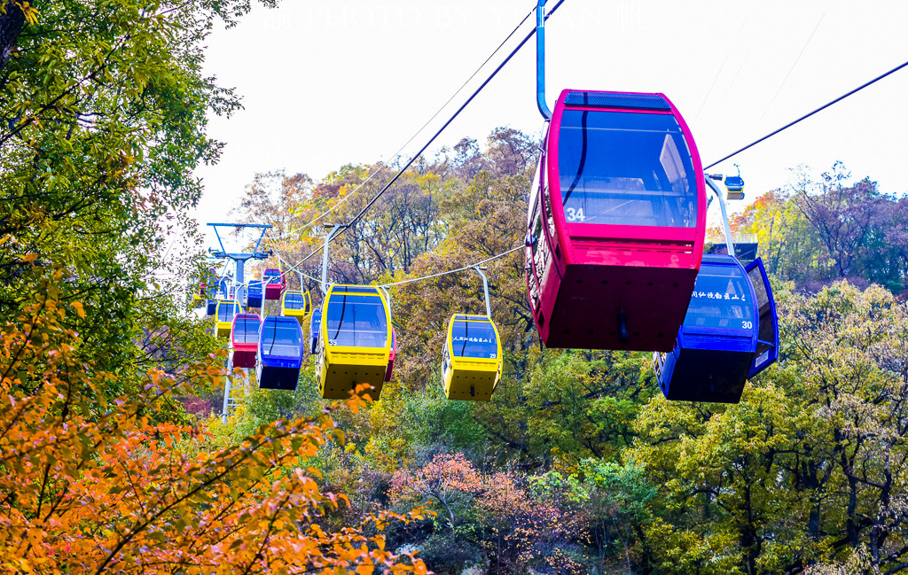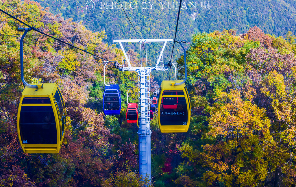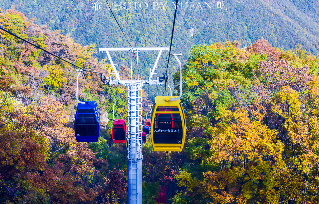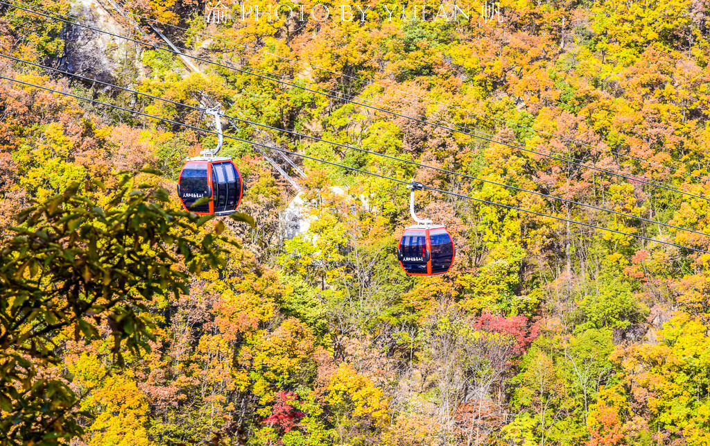 穿过五颜六色的从林,翻过一座又一座山峰,远处连绵起伏的群山、下面层层叠叠的九龙瀑布群、四周五彩斑斓的秋色,一起构成一幅移动的美丽画卷,这无疑是中国最美的索道之一,有山、有水、有彩林,真的让人留连忘返,甚至让很多人都觉得得时间太短,根本没坐够。