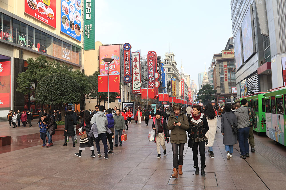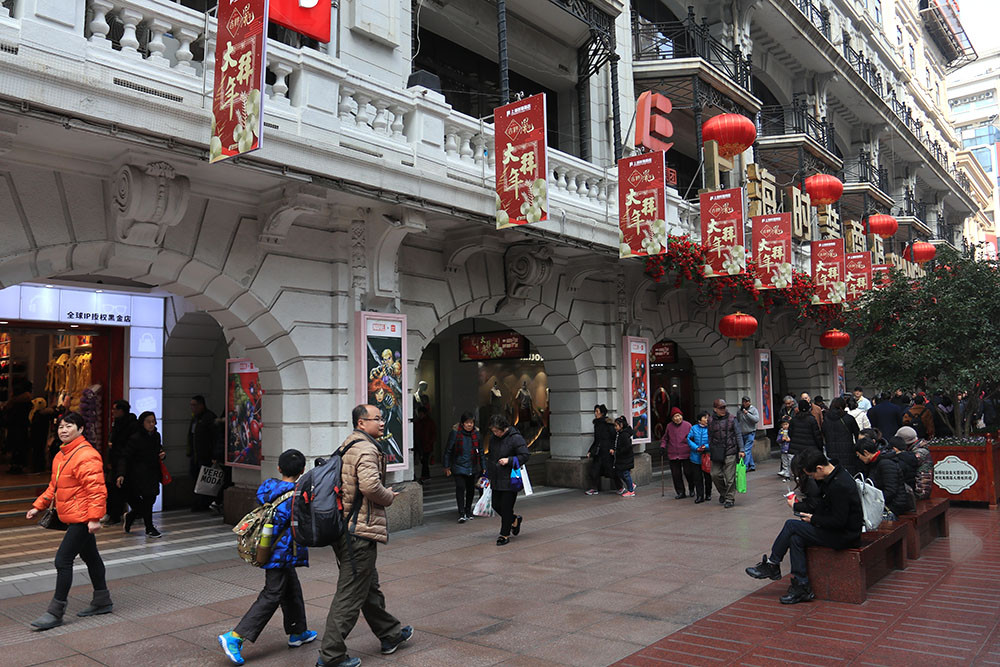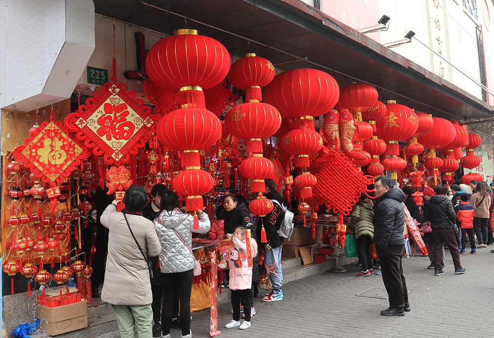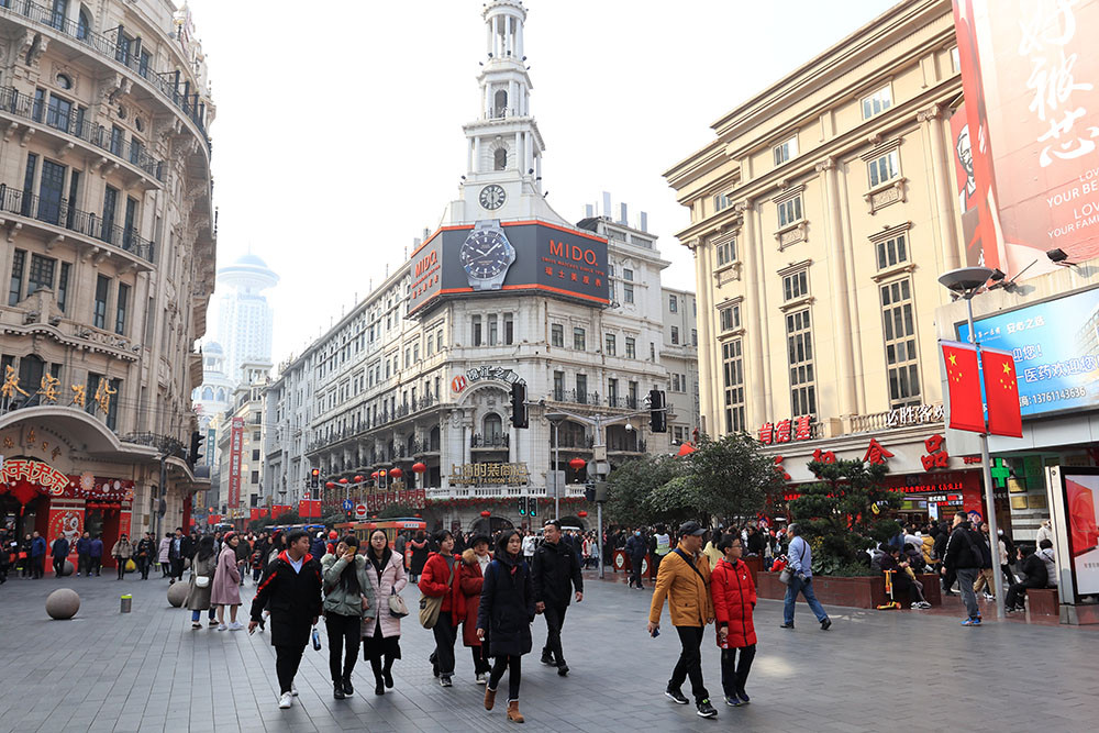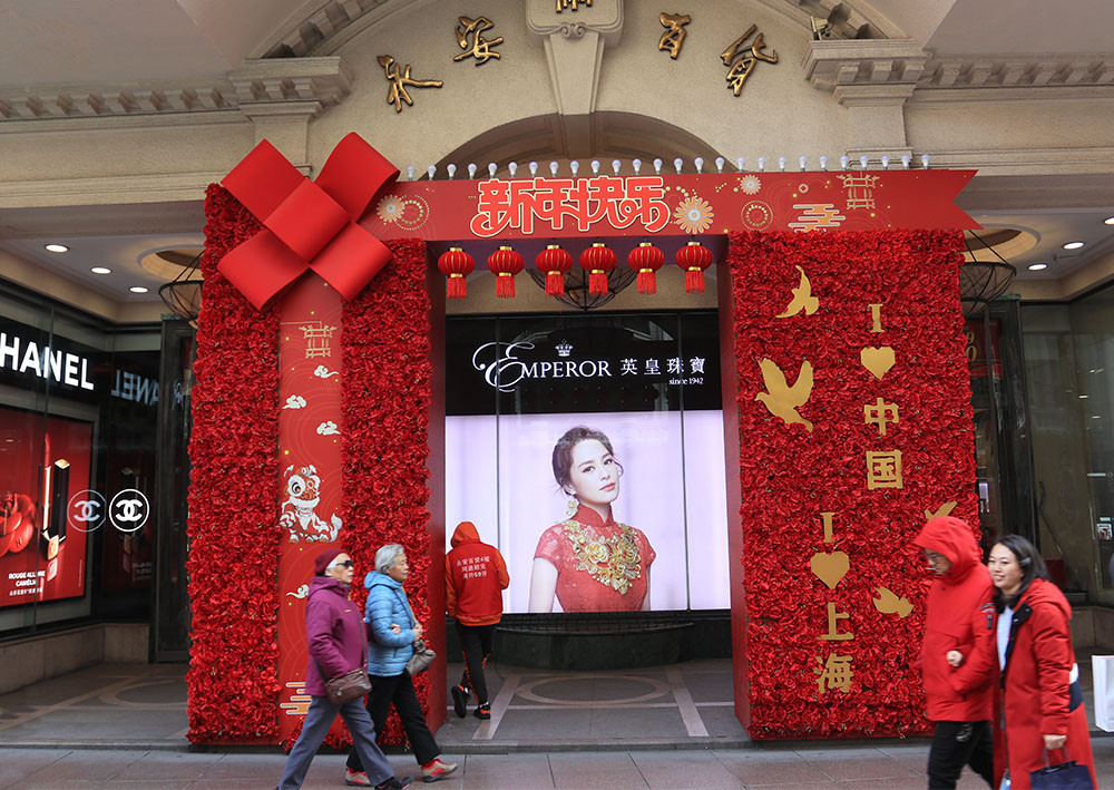 南京路完全被节日的气氛所覆盖,成了一片红色的海洋,各家店铺里都挤满了购物的人们。大街上,没有口罩,没有惊恐,人们的脸上洋溢着节日的笑容。