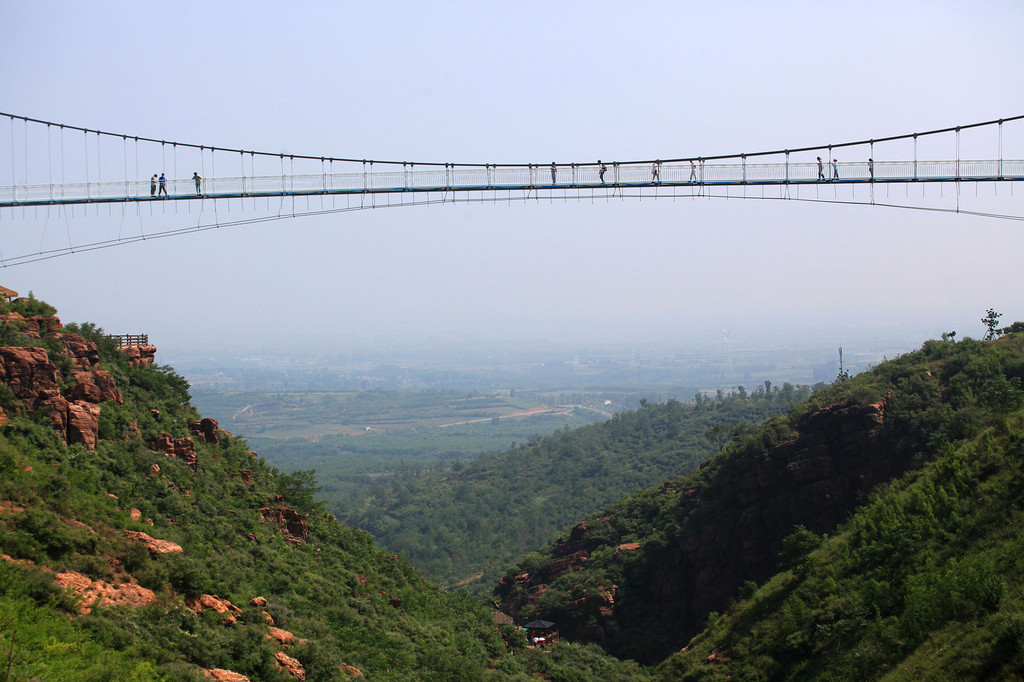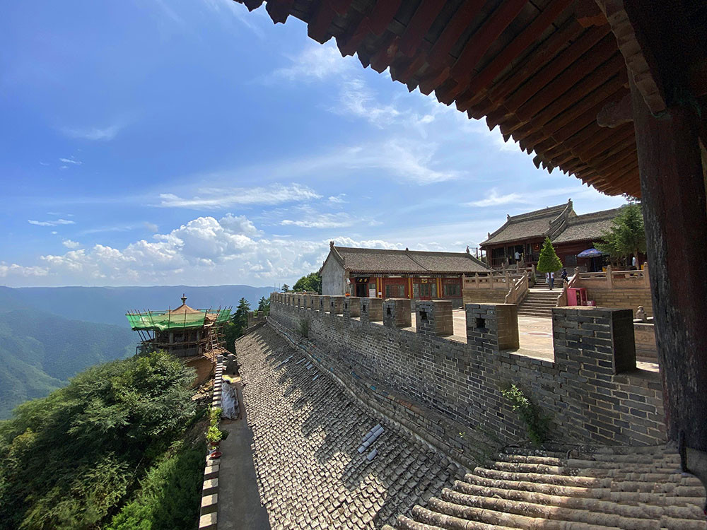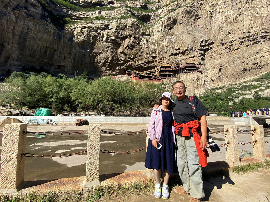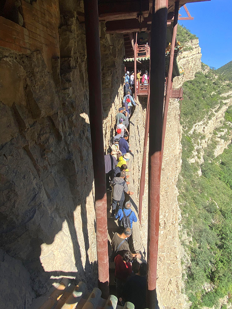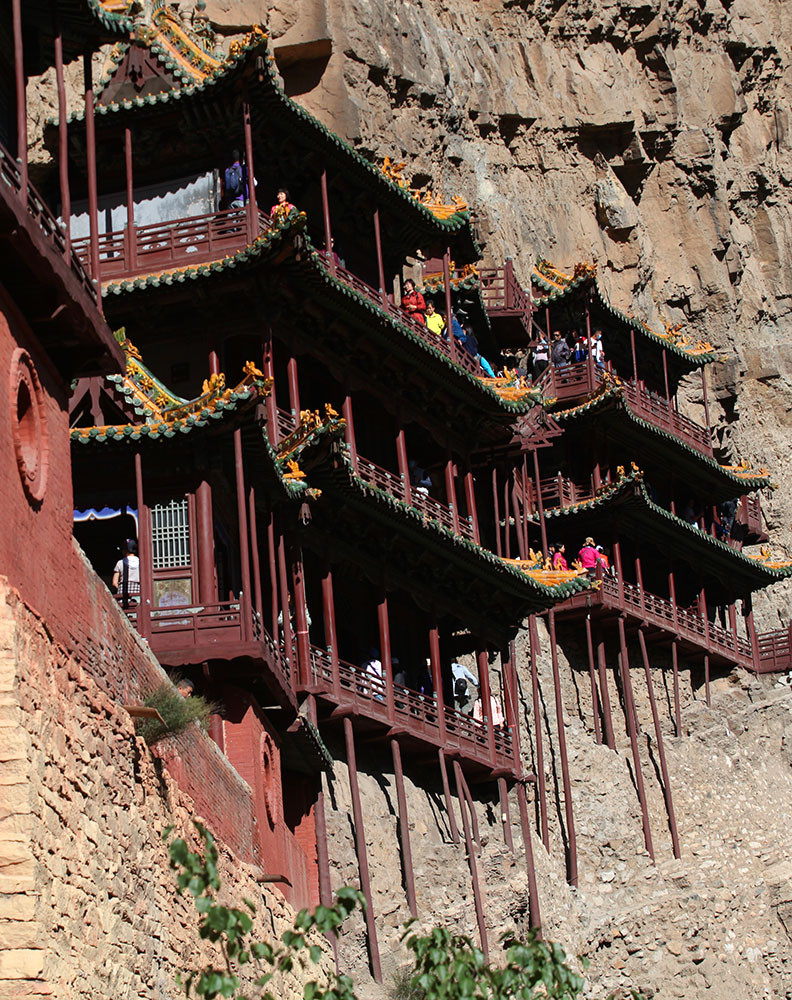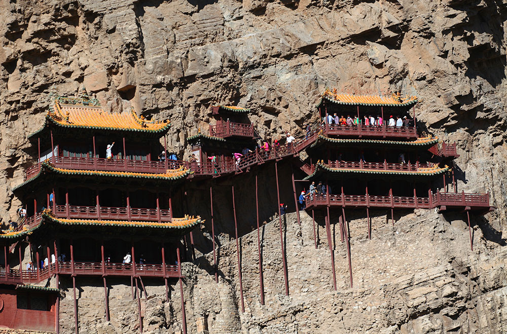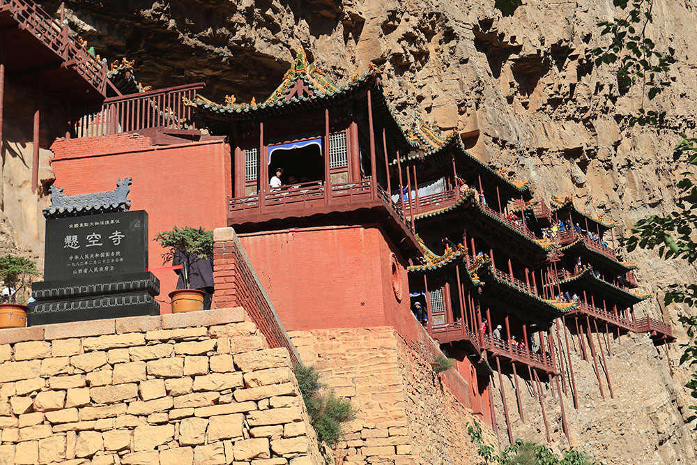 悬空寺位于北岳恒山金龙峡西侧翠屏峰的峭壁上,是一座佛、道、儒三教合一的独特寺庙。大殿雄峙,凌空相望,栈道飞架,首尾相连。走在悬空的栈道上,脚下就是深谷,腿不由得打起哆嗦来。