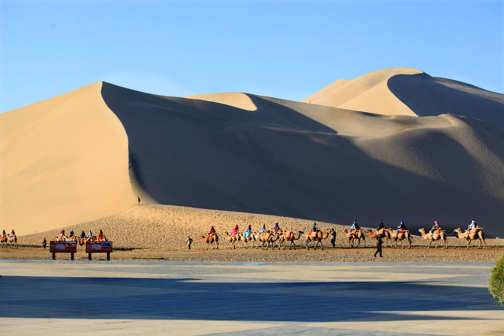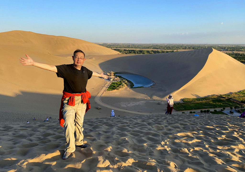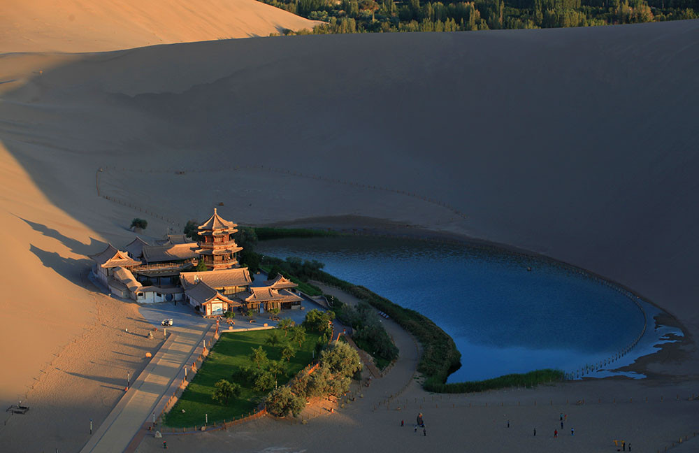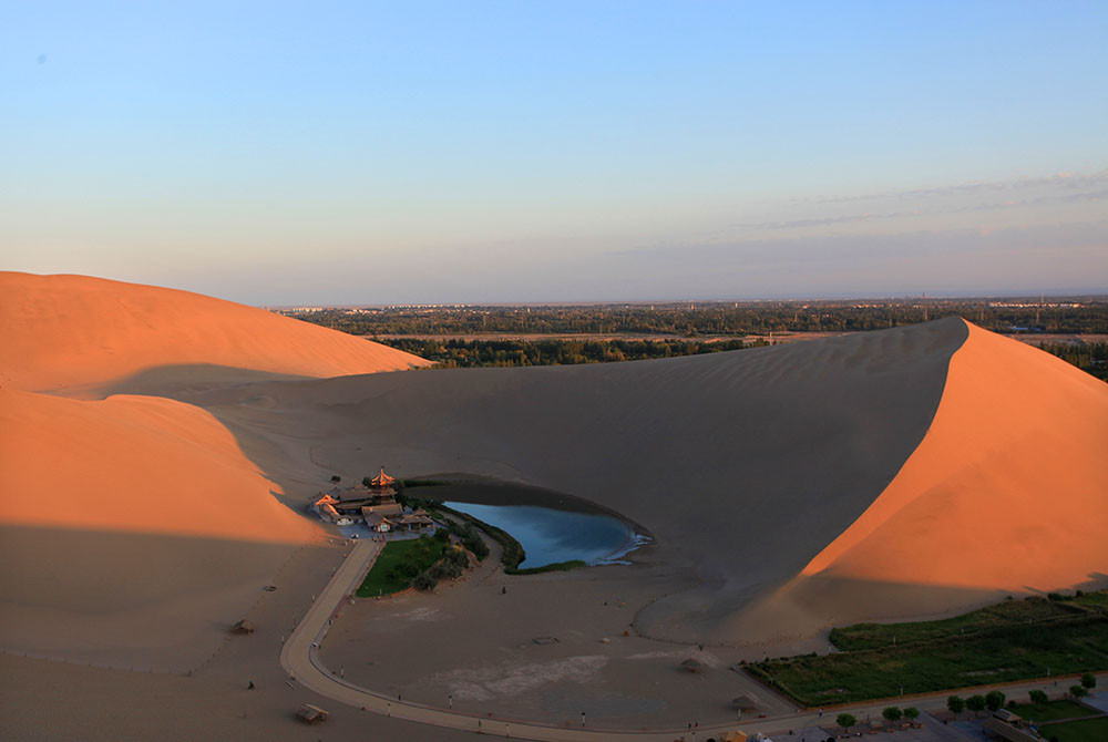 出青海,到敦煌,那是去了多次的地方。起个大早,上到鸣沙山上,去俯拍晨光里的月牙泉。