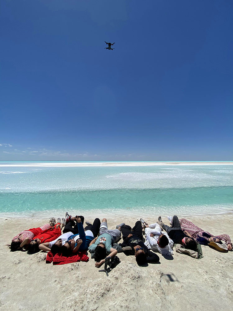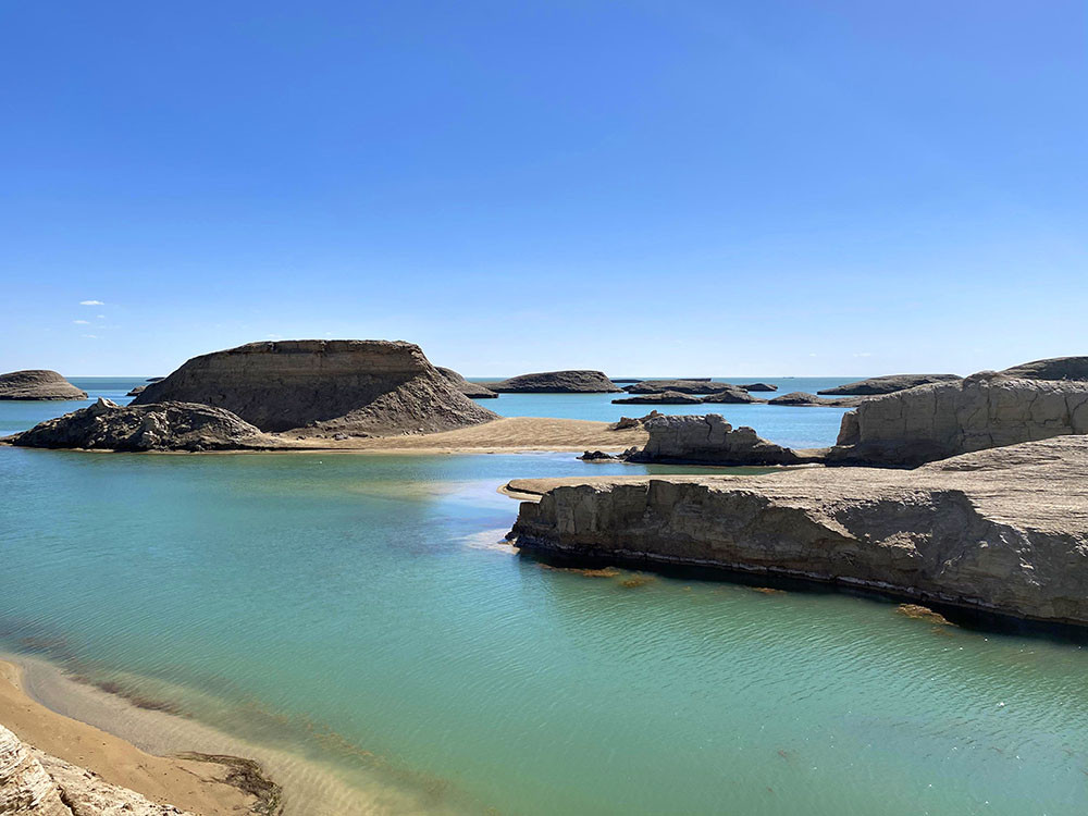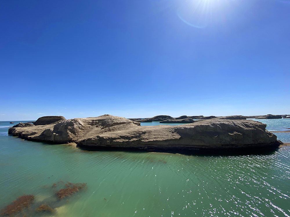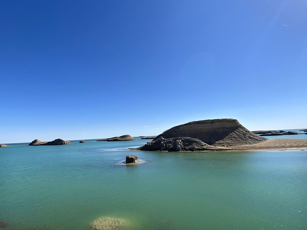 乌素特水上雅丹距离东台吉乃尔湖27公里,浩瀚的水面上漂浮着一座座土山,我们沿着湖边行走,寻找着制高点,变换着角度,去拍摄那难得的画面。