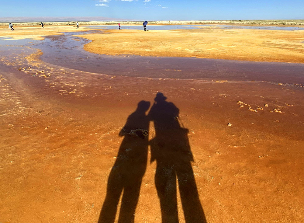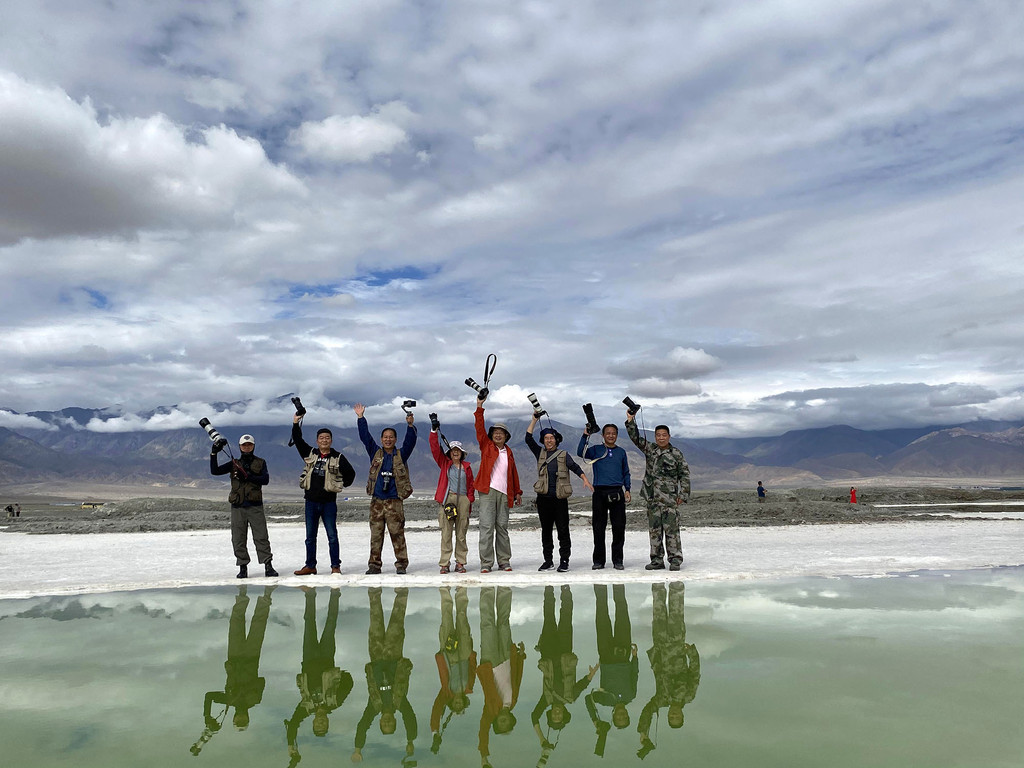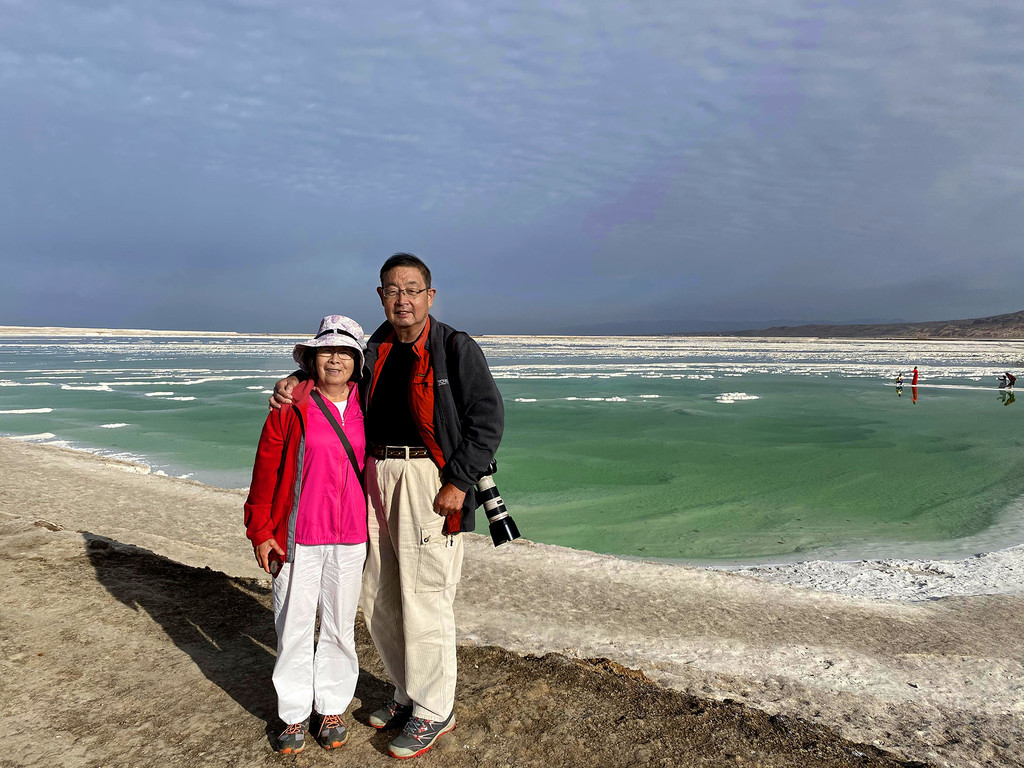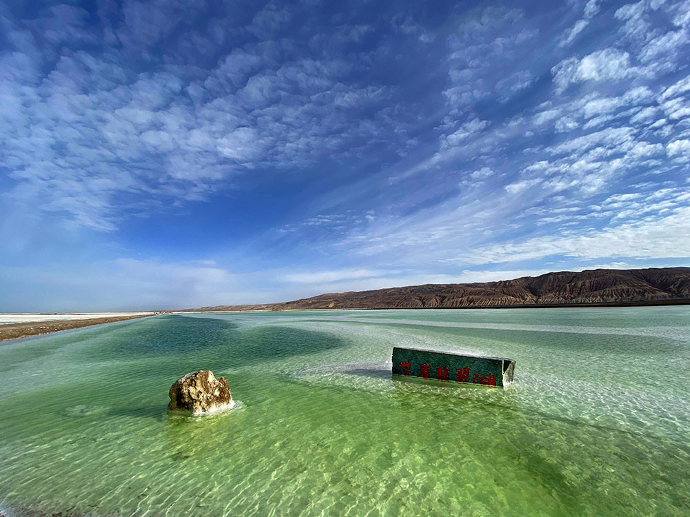 大柴旦有个翡翠湖,那是一个极漂亮的地方。可惜天气阴沉,开车去踩踩点吧。到了湖畔,云开日出,露出蓝天白云。等我们拍摄完毕,阴云四合,天又阴了。前后不过一个小时,运气,不服不行!