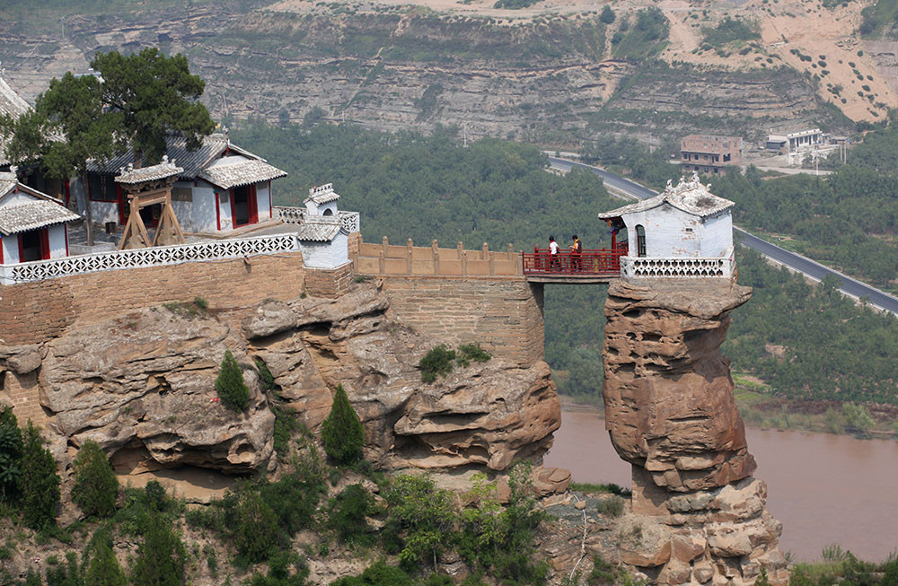 佳县的香炉寺很小,地理位置却很特殊,它建在黄河岸边的悬崖上。距悬崖不远有一根石柱,高20余米,周长约15米,人称“香炉峰”。峰顶有一座观音庙,一条5米长、1米宽的天桥把它和寺院连接起来。
