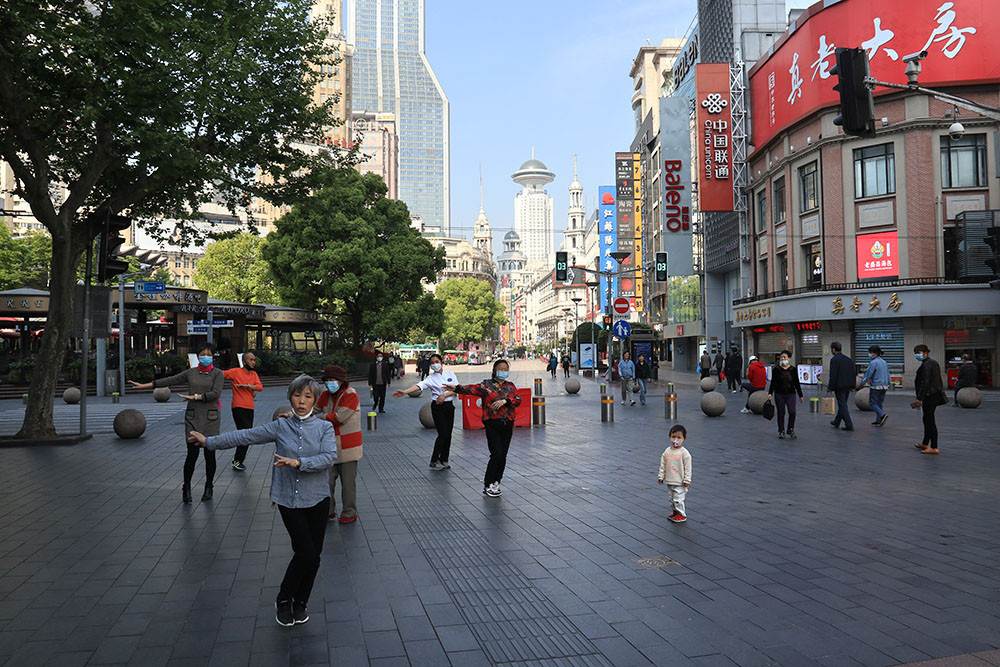 平日里人山人海的外滩,现在寂静了不少。一群小学生在老师的带领下欢快的跳起了舞蹈。