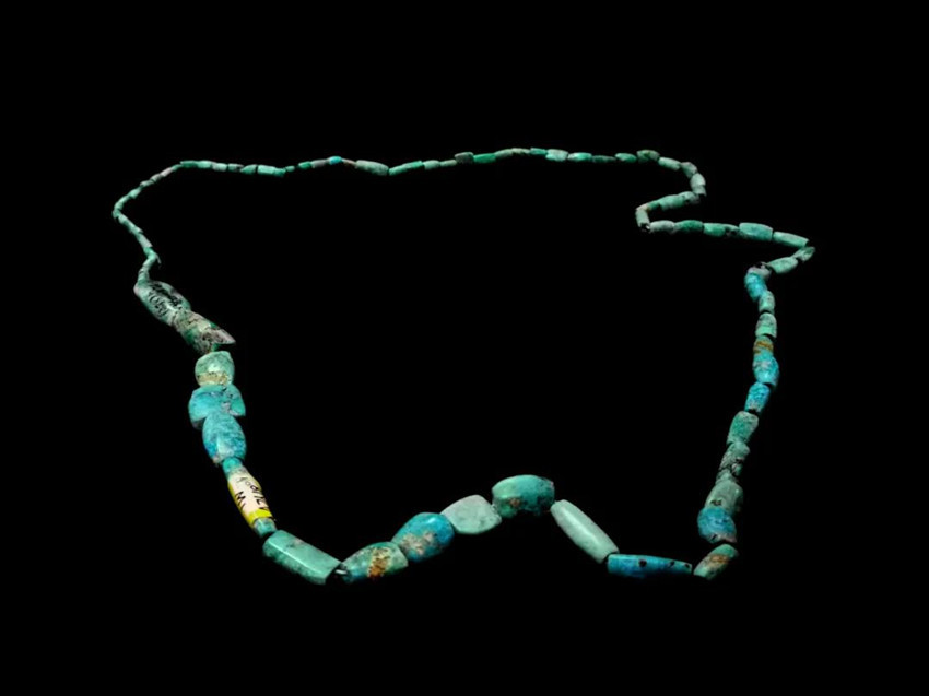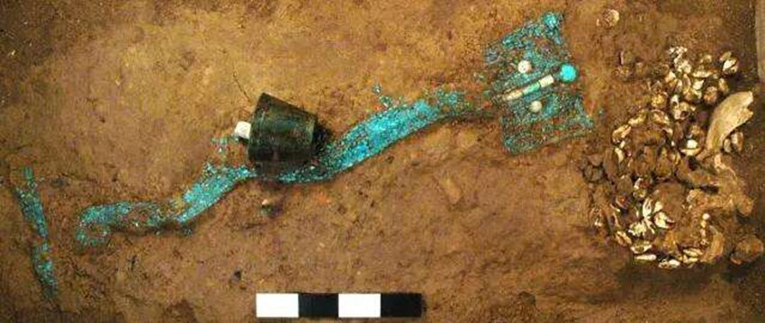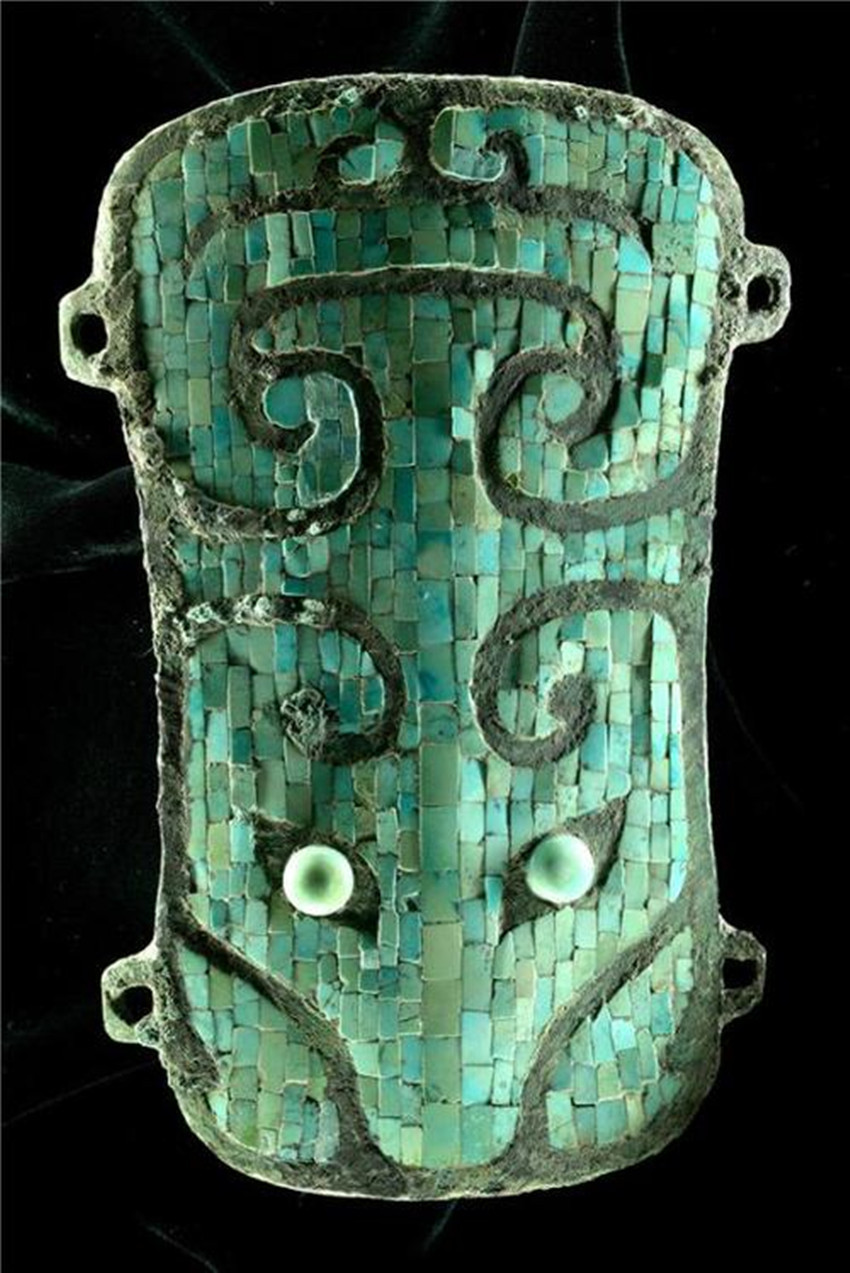 另一位逝者的胸前,安放着一枚镶嵌了绿松石的兽面纹铜牌。这枚呈亚腰形的铜牌长16.5厘米,最宽处11厘米,器身框架以青铜铸造,四角钝圆,主体以数百片绿松石拼合出兽面纹,丝丝入扣,通过两侧对称的环纽固定在逝者的身上,用以完成沟通天、地、神、人的使命。谁能相信?当三千多年后重见天日之时,拥有它的主人早已腐朽为无可复原的灰烬,而这枚加工精巧的铜牌依然安好如初,数百颗绿松石没有一颗松动脱落。