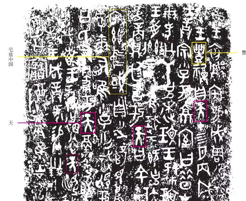 迄今为止,比《尚书》里更早,出现的“中国”一词,是在一件被命名为“何尊”的西周青铜器上。1963年,何尊出土于宝鸡贾村,尊内底部的铭文由一位姓何的宗族小子刻录,记述了成王继承武王遗志,营建成周(洛阳)之事。全文如下: