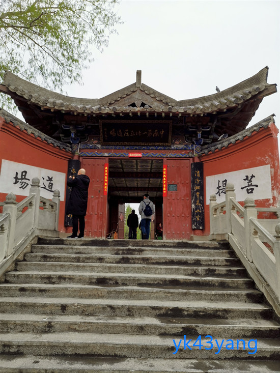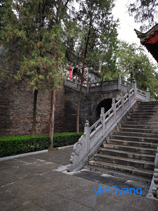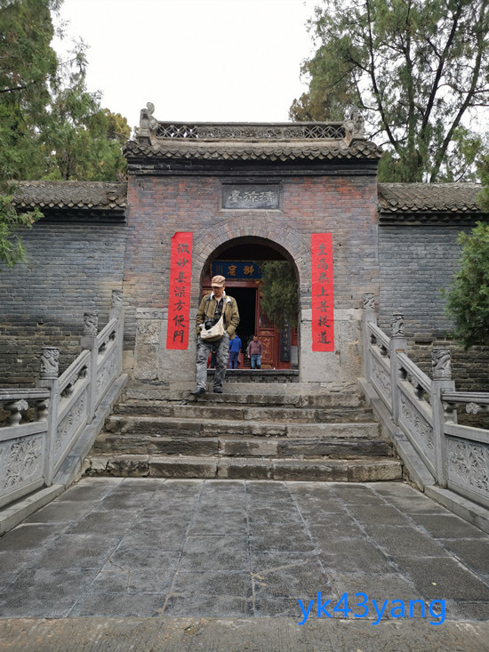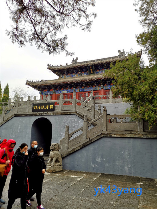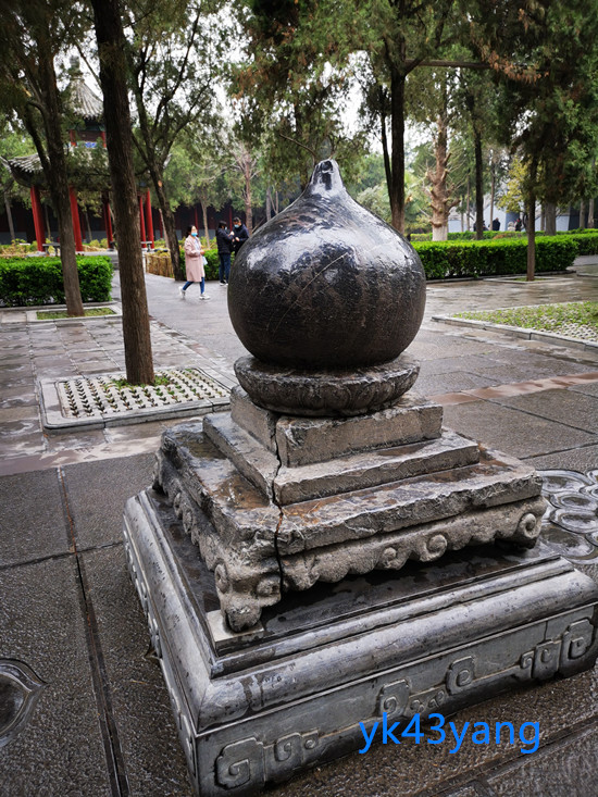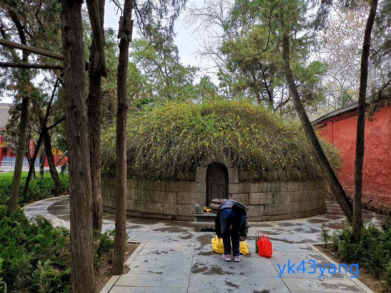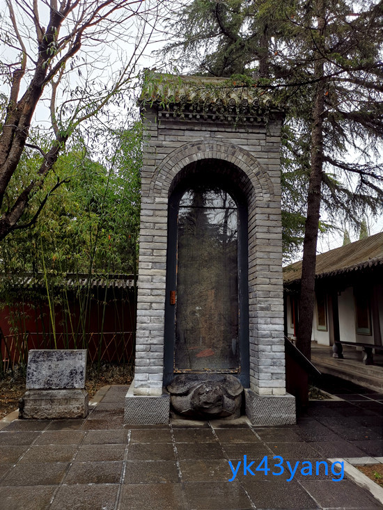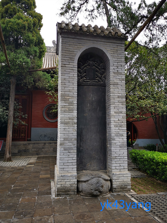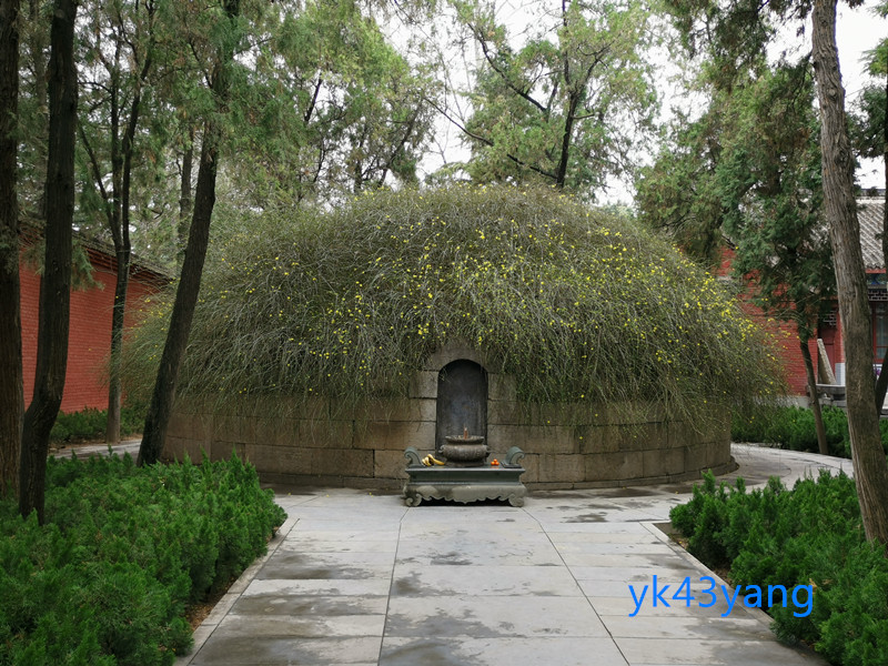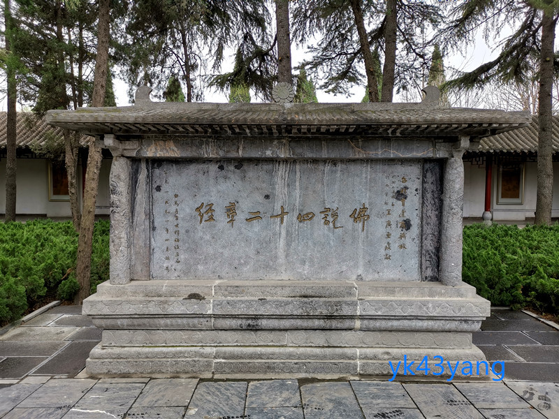 进入山门,先向东行,东侧院墙尽头是摄摩腾大师的墓葬。他的墓前立有大师的画像碑和“四十二章经”纪念碑。