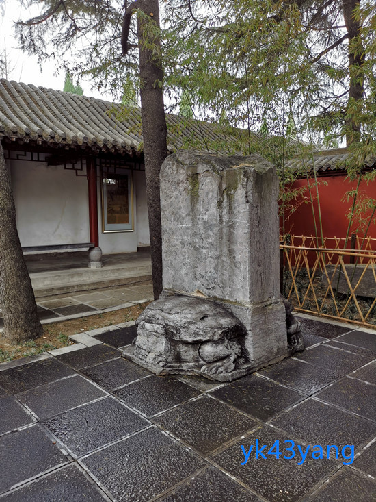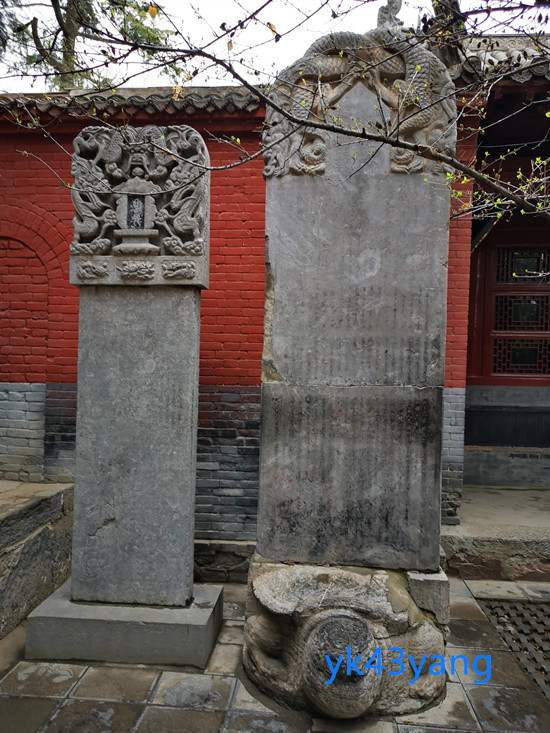 西侧立着两块碑,那块碑身断裂的,称为“断文碑”,是白马寺中的一大看点。