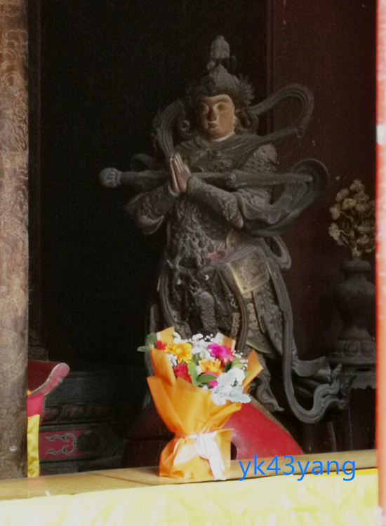 从大雄殿的窗户外,拍了一张韦陀菩萨的塑像。